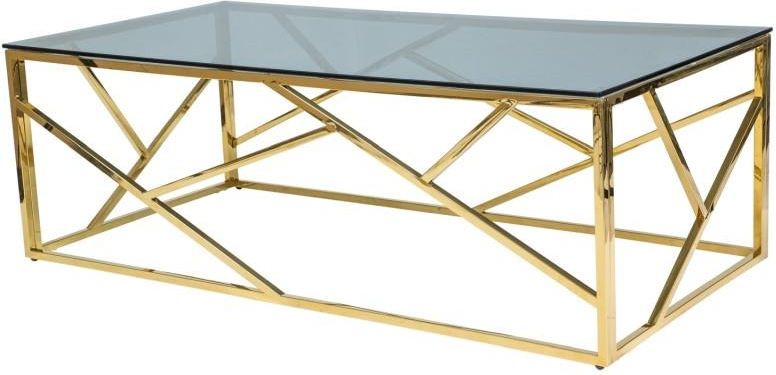 Ława Escada A szkło/złoty Piękna i niezwykle efektowna ława Escada zachwyca swoim designem i jakością wykonania. Geometryczne wzory zapewnią nowoczesny wygląd wnętrza. Blat wykonany ze szkła hartowanego gwarantuje bezpieczeństwo użytkowania. Szkło hartowane charakteryzuje się wysoką odpornością na pęknięcia i stłuczenia, a także na działania wysokich temperatur. Dzięki temu bez obaw możemy stawiać na blacie filiżanki z gorącą kawą czy talerze z ciepłymi przystawkami. Na dużą uwagę zasługuje futurystyczny stelaż wykonany z solidnego metalu malowanego proszkowo na modny, złoty kolor. W połączeniu z dymionym szkłem hartowanym tworzy niepowtarzalny, nowoczesny design, który idealnie wpasuje się we wnętrza urządzone w stylu glamour. Najważniejsze cechy: Nowoczesny design Blat wykonany z wytrzymałego szkła hartowanego Futurystyczny stelaż w złotym kolorze Grubość blatu 8 mm Maksymalne obciążenie 50 kg Produkt do samodzielnego złożenia Dane techniczne: Blat Materiał: szkło hartowane Kolor: szkło dymione Stelaż Materiał: metal Kolor: złoty Wymiary: Szerokość - 60 cm Długość - 120 cm Wysokość - 40 cm