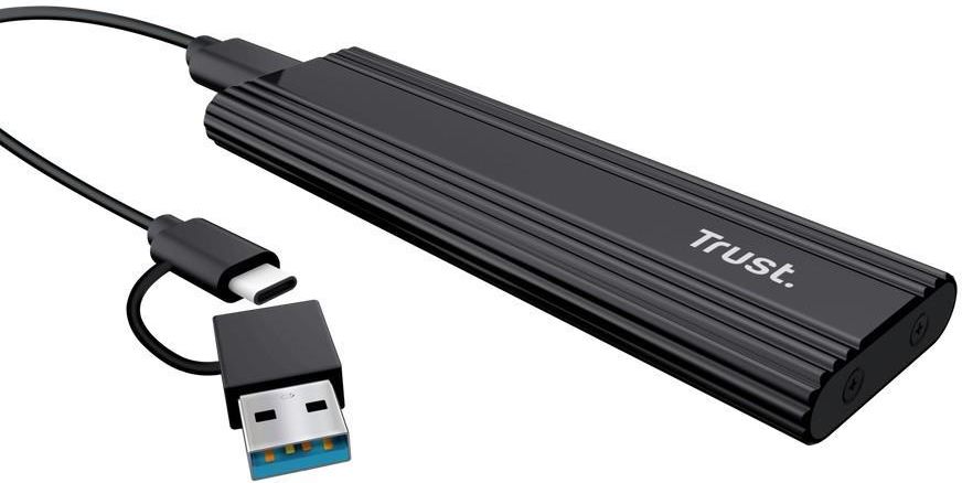 TRUST Obudowa dysku SSD M.2 USB-C Obudowa dysku SSD M.2 USB-CKompaktowa i wytrzymała obudowa USB-C dla dysków SSD M.2 Mała obudowa, duża pamięćDzięki swojej uniwersalnej konstrukcji ta obudowa SSD działa z każdym laptopem lub telefonem ze złączem USB-C, obsługując dyski SSD M-Key w wielu formatach do 4 TB. Prędkość transferu do 10 Gb/s sprawia, że jest to idealne przenośne rozwiązanie do błyskawicznego przechowywania plików i tworzenia kopii zapasowych. Przenośna i praktycznaTa kompaktowa obudowa aluminiowa idealnie nadaje się do użytku podczas podróży. Dołączony śrubokręt i śrubki sprawiają, że ta obudowa SSD jest gotowa do użycia w ciągu kilku minut, a do urządzenia można ją z łatwością podłączyć za pomocą dołączonego kabla USB-C-C lub przejściówki USB-C-A. Szybo i prosto? Tylko z SSD! Typ: Obudowa zewnętrzna Interfejs dysku: M.2 Złącza: 1 x USB (Type C) Materiał: ABS Kolor: Czarny Wymiary: 9 x 32 x107 mm Waga: 45 g Pozostałe parametry: Prędkość USB 10 000 Mb/s Wersja USB 3.2 gen. 2, 3.2 gen. 1, 2.0 Kompatybilne typy urządzeń: komputer laptop smartfon tablet smart tv