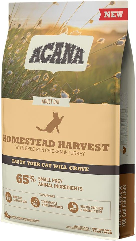 Przeznaczenie karmy Acana Homestead Harwest CatPełnoporcjowa karma dla dorosłych kotów wszystkich ras, w wieku powyżej roku. Pokarm na bazie kurczaka i indyka z wolnego wybiegu. Karma z kurczakiem, indykiem, kaczką i jajami ściółkowymi. 68% składników zwierzęcych. Charakterystyka karmy Acana dla kotówWszystkie koty, jako mięsożercy, są naturalnie przystosowane do diety bogatej w różne gatunki mięs, z dodatkiem owoców, warzyw i ziół. Dlatego karma Acana Homestead Harwest jest przepełniona najlepszymi składnikami pochodzenia zwierzęcego. Zawiera mięso kurczaka i indyka z wolnego wybiegu, mięso kaczki i jaja z lokalnych farm, z chowu bezklatkowego. Składniki te dostarczane są codziennie ŚWIEŻE, pełne wartości odżywczych. Główne cechy karmy Acana Homestead Harwest Cat:► Wspiera odporność Karma zawiera wszystkie, niezbędne witaminy, minerały i przeciwutleniacze pomagające w utrzymaniu zdrowego układu immunologicznego. ► Wspiera zdrowe serce i wzrok Obecne w recepturze karmy -tauryna, EPA i DHA to podstawowe składniki odżywcze, których koty potrzebują, aby zachować zdrowe oczy i serce ► Dba o zdrowie skóry i piękno sierści Równowaga kwasów tłuszczowych Omega-3 i Omega-6 zapewnia zdrową skórę i lśniącą sierść. ► Karma o wyjątkowej smakowitości Składniki zwierzęce małych gatunków oraz dodatek liofilizowanej wątróbki zapewniają smak, którego pragną koty. ACANA jest przygotowana z najlepszych i najświeższych kanadyjskich składników w jedynej na świecie, nagradzanej kuchni Champion Petfoods. Dzięki tej karmie Twój kot będzie zdrowy i silny. Wyprodukowana jest ze świeżych, naturalnych składników, dlatego chrupki mogą różnić się kształtem i kolorem. Wysoka zawartość białka zwierzęcego i ograniczona ilość węglowodanów idealnie pasuje do naturalnej diety kotów. W miejsce zbóż o wysokim indeksie glikemicznym, które są źródłem szybkostrawnych węglowodanów, takich jak biały ryż, pszenica czy kukurydza, karma ACANA zawiera owies oraz zdrowe owoce i warzywa, o niskim indeksie glikemicznym. Składniki zawarte w Acana są naturalnym źródłem witamin i minerałów, które są potrzebne do prawidłowego rozwoju kotów. Warzywa, owoce i zioła zawarte w karmie ACANA, takie jak: groch, zielona soczewica, ciecierzyca, czerwona soczewica, dynia piżmowa, dynia, żurawina, borówki, usprawniają metabolizm, poprawiają pracę u kładu trawiennego, odtruwają organizm i wspierają odporność kota. Olej z rdzawca jest źródłem nienasyconych kwasów tłuszczowych, które wspierają system immunologiczny, dbają o sierść i skórę pupila. Liofilizowana wątroba kurczaka i indyka niezwykle zwiększa smakowitość karmy. Naśladując naturę, jedzenie ACANA charakteryzuje się proporcjami WholePrey- zawiera mięso, ograny, chrząstki i kości. Karma Acana ma bogate właściwości odżywcze dzięki równowadze mięsa, organów, chrząstek, która odzwierciedla całość organizmu zwierzęcia upolowanego przez drapieżnika. W ten sposób dostarczane są składniki odżywcze dla Twojego kota. Zalety karmy Acana Homestead Harwest Cat:► karma dla wszystkich dorosłych kotów ► 65% składników mięsnych i 37% białka ► świeże, niemrożone składniki ► różnorodność białek zwierzęcych: kurczak, indyk, kaczka ► dodatek liofilizowanej wątróbki podnosi smakowitość karmy ► zawiera kwasy Omega, pochodzące z oleju z rdzawca ► zawiera naturalne składniki - źródło wszystkich potrzebnych kotu witamin i minerałów ► unikalna formuła uzupełniona o warzywa, owoce i zioła ► świeża dynia i dynia piżmowa jako źródło włókien ułatwiających trawienie. ► soczewica ma działanie oczyszczające, jest łatwoprzyswajalna i nie uczula ► żurawina dla wsparcia układu moczowego kota, aby zapobiegać infekcjom nerek i pęcherza moczowego ► borówka aby wspomóc pracę układu odpornościowego ► formuła zawierająca zróżnicowane, świeże, naturalne składniki ► bez wypełniaczySkładniki suchej karmy Acana dla kotówŚwieże mięso kurczaka (17%), dehydratyzowane mięso kurczaka (15%), dehydratyzowane mięso indyka (13%), cały owies, cały groch, tłuszcz kurczaka (7%), cała zielona soczewica, cała ciecierzyca, cała czerwona soczewica, świeże jaja (4%), świeże mięso indyka (4%), włókno soczewicy, olej z rdzawca (1%), świeże mięso kaczki (1%), chrząstki kurczaka (1%), świeże organy kurczaka (wątroba, serce) (1%), świeże organy indyka (wątroba, serce) (1%), suszony kelp, świeża cała dynia piżmowa, świeża cała dynia, świeża cała żurawina, świeże całe borówki. Dodatki (na kg): Dodatki technologiczne: naturalne antyoksydanty. Dodatki żywieniowe: chlorek choliny: 1200 mg, tauryna: 400 mg, cynk (uwodniony aminokwasowy chelat cynku): 150 mg. witamina B1: 25 mg, witamina B2: 10 mg, niacyna: 50 mg, witamina B5: 8 mg, witamina B6: 7.5 mg, kwas foliowy: 0.75 mg, biotyna: 0.03 mg, witamina B12: 0.1 mg, witamina A: 1850 IU, witamina D: 250 IU, witamina E: 175 IU, miedz (uwodniony aminokwasowy chelat miedzi (II) ): 11 mg. L-karnityna: 50 mg, DLmetionina: 99 mg. Dodatki zootechniczne: Enterococcus faecium NCIMB10415: 600x10^6CFU Energia metaboliczna (w suchej masie) 4,178 kcal/kg Energia metaboliczna (w świeżej masie) 3,760 kcal/kg Rozkład kalorii: Białko 36 %, Tłuszcze 36 %, Warzywa i owoce 28 % Analiza składu karmy Acana Homestead HarwestBiałko surowe 37,2 % Oleje i tłuszcze surowe 17,5 % Włókno surowe 2,16 %, Wapń 1.99%, Fosfor 1.51% Witaminy: Witamina A: 40,333 IU/kg, Witamina D3: 1,000 IU/kg, Witamina E: 111 IU/kg, Witamina B1 (tiamina)56.7 mg/kg, Witamina B2 (ryboflawina) 21.1 mg/kg, Witamina B5 (kwas pantotenowy) 22.4 mg/kg, Witamina B3 (niacyna) 159 mg/kg, Witamina B6 (pirydoksyna) 11.1 mg/kg, Kwas foliowy 1.57 mg/kg, Witamina B12 (cyjanokobalamina) 0.11 mg/kg, Cholina 2,388 mg/kg Minerały Potas 0.74%, Sód 0.36%, Chlorek 0.31%, Ż
