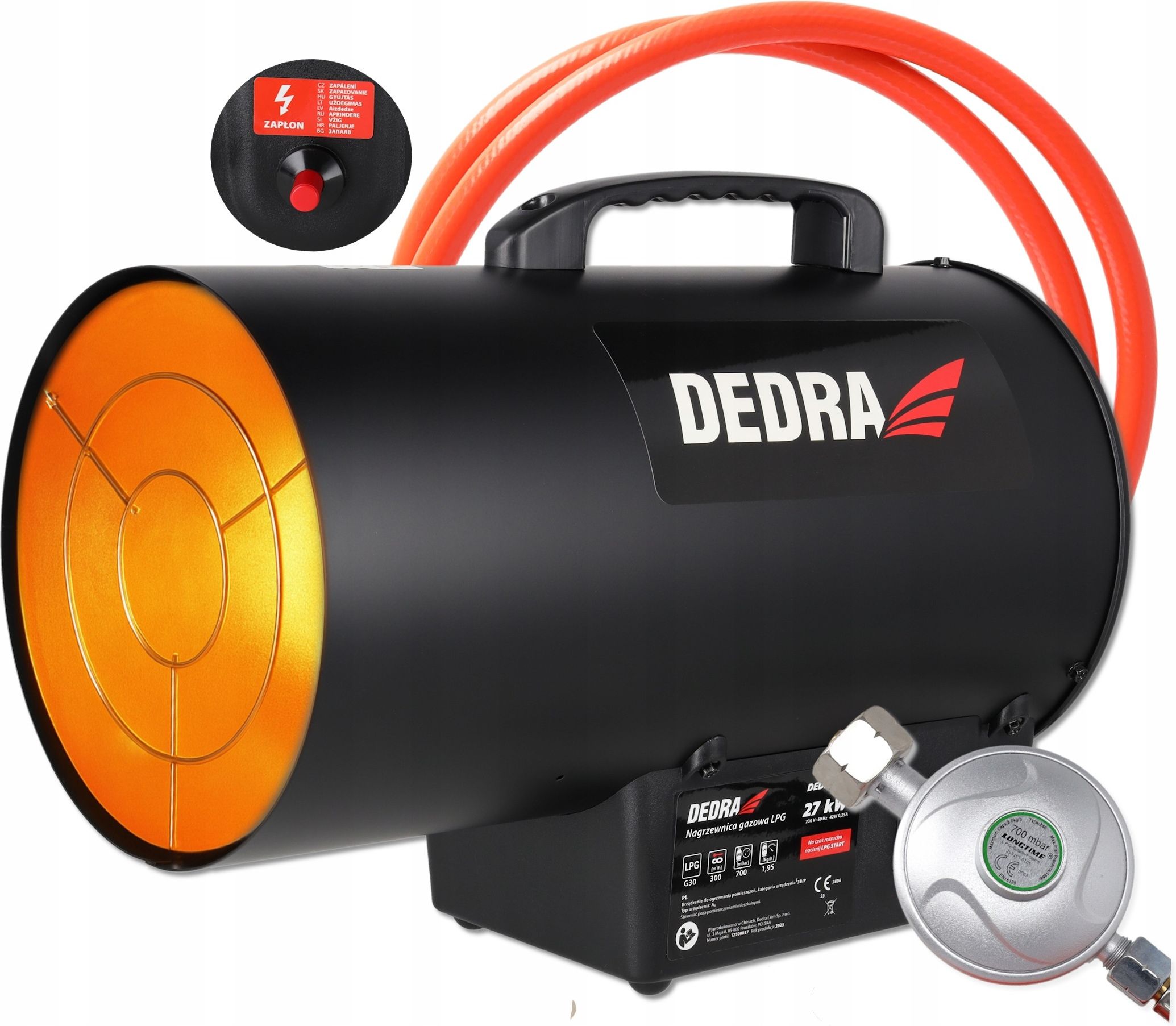 Nagrzewnica gazowa 27 kW DEDRA 230V z zapłonem PIEZO – szybki start i wygodne ogrzewanie. 👉 DED9943A reduktor + wąż w zestawie 🔥 NAGRZEWNICA GAZOWA DEDRA DED9943A 27 kW - szybkie i skuteczne ogrzewanie warsztatu, magazynu czy hali Moc 27 kW – natychmiastowe podniesienie temperatury w średnich i dużych pomieszczeniach Przepływ powietrza 300 m³/h – intensywny nadmuch, który skutecznie rozprowadza ciepło Zużycie gazu tylko 1,95 kg/h – efektywne ogrzewanie na standardowej butli 11 kg Zapłon PIEZO – szybkie uruchomienie jednym przyciskiem, bez zapałek W zestawie reduktor Z80 i wąż – gotowa do pracy od razu po podłączeniu Zakup bezpośrednio od producenta + serwis + części - gwarancja jakości Nagrzewnica gazowa DEDRA DED9943A to sprawdzone i proste w obsłudze urządzenie do szybkiego ogrzewania pomieszczeń roboczych tam, gdzie liczy się skuteczność, mobilność i niezawodność. 🔥 DED9943A Moc i wydajność – szybkie ciepło tam, gdzie go potrzebujesz Moc grzewcza 27 kW pozwala w krótkim czasie podnieść temperaturę w pomieszczeniu, zapewniając komfortowe warunki pracy nawet w chłodne dni. Wbudowany wentylator z nadmuchem 300 m³/h: wspomaga proces spalania, przyspiesza nagrzewanie, równomiernie rozprowadza ciepłe powietrze w całym pomieszczeniu. Efekt: ciepło odczuwalne szybko i dokładnie tam, gdzie pracujesz. DEDRA to marka, której klienci ufają. Firma od lat dba o najwyższą jakość produktów i zadowolenie klientów. Każda nagrzewnica posiada tabliczkę z numerem partii i rokiem produkcji, co pozwala na pełną identyfikację i kontrolę jakości. Efektywne i ekonomiczne ogrzewanie Zużycie gazu na poziomie 1,95 kg/h zapewnia dobrą równowagę między mocą, a kosztami eksploatacji. Standardowa butla 11 kg pozwala na kilka godzin ciągłej pracy, bez częstego wymieniania źródła gazu. To praktyczne rozwiązanie do warsztatów, garaży, magazynów, szklarni, hal namiotowych, podczas prac remontowo-budowlanych tj. osuszanie dogrzewania tymczasowych stanowisk pracy 🛡️ Bezpieczna praca i solidna konstrukcja Nagrzewnica została zaprojektowana z myślą o bezpiecznym użytkowaniu w suchych i dobrze wentylowanych pomieszczeniach: Stopień ochrony IP20 – do pracy w suchym środowisku, Klasa ochrony przeciwporażeniowej I – wymaga uziemionego gniazda, co zwiększa bezpieczeństwo, stabilna, solidna konstrukcja, ręczny zawór bezpieczeństwa, sprawdzony zapłon piezoelektryczny. Prosta obsługa – 3 kroki do ciepła Wszystkie elementy sterujące są przemyślanie rozmieszczone, a obsługa nie wymaga żadnych dodatkowych narzędzi ani skomplikowanych ustawień. Podłącz butlę gazową do reduktora i dokładnie dokręć Włącz zasilanie wentylatora Uruchom zapłon PIEZO jednym przyciskiem 👉 Bez skomplikowanych ustawień – odpalasz i grzejesz. Wygodna obsługa nawet w rękawicach roboczych. 🧳 Mobilność i wygoda użytkowania Waga tylko 5,7 kg Wygodny uchwyt transportowy Dzięki niedużym wymiarom nagrzewnicę łatwo przenieść między pomieszczeniami lub zabrać na miejsce pracy. Idealna do zastosowań mobilnych i tymczasowych stanowisk roboczych. 📦 Pełen zestaw – gotowa do pracy od razu W opakowaniu otrzymujesz wszystko, czego potrzebujesz do uruchomienia urządzenia: Nagrzewnica gazowa DED9943A – 27 kW Przewód gazowy ~1,5 m Reduktor typu Z80 – do butli LPG Uchwyt transportowy Instrukcja obsługi w języku polskim Intuicyjna i łatwa w użyciu, bez dodatkowych zakupów. 🏭 Zastosowanie w praktyce 👉 DED9943A sprawdzi się idealnie do: Szybkiego dogrzania warsztatu przed rozpoczęciem pracy Dogrzewania miejsc pozbawionych centralnego ogrzewania Ogrzewania garażu, magazynu lub tymczasowych stanowisk pracy Utrzymania komfortowej temperatury podczas prac wykończeniowych Wspomagania schnięcia farb i tynków oraz osuszania Prac remontowych i budowlanych w chłodnych warunkach 🔧 Dane techniczne Moc grzewcza: 27 kW Zasilanie: 230 V ~ 50 Hz Przepływ powietrza: 300 m³/h Paliwo: LPG (propan–butan, G30) Zużycie paliwa: 1,95 kg/h Ciśnienie wyjściowe reduktora: 700 mBar Stopień ochrony: IP20 Klasa ochrony: I Waga: 5,7 kg Ustawienie nagrzewnicy Aby zapewnić prawidłową pracę i bezpieczeństwo, nagrzewnicę ustaw na stabilnej, równej powierzchni z zachowaniem minimalnych odległości od otoczenia: 2 m od góry 2,5 m od tyłu 3,5 m od wylotu 2 m po bokach 👉 Dzięki temu urządzenie działa bezpiecznie i efektywnie. 🔵 Marka DEDRA – sprawdzona jakość narzędzi DEDRA to rozpoznawalna marka narzędzi i urządzeń warsztatowych, ceniona i wybierana przez fachowców i użytkowników domowych. Produkty DEDRA łączą: solidne wykonanie, prostą obsługę, dobrą relację ceny do możliwości, DED9943A to uczciwa, konkretna nagrzewnica, która zapewnia skuteczne i niezawodne ogrzewanie. Nagrzewnica gazowa DEDRA DED9943A – co oferujemy Natychmiastowy start PIEZO – uruchomienie jednym kliknięciem, bez dodatkowych narzędzi Równomierne ogrzewanie – wentylator szybko rozprowadza ciepło po pomieszczeniu Wysoka moc 27 kW – szybkie podniesienie temperatury w warsztatach, garażach i małych halach Solidna i trwała obudowa – odporna na uszkodzenia, zapewnia bezpieczeństwo i długą żywotność Lekka i mobilna – uchwyt transportowy ułatwia przenoszenie i przechowywanie Bezpieczeństwo pracy – stabilna konstrukcja i zabezpieczenia gwarantują niezawodność Sprawdź zanim kupisz u konkurencji Trudny start – brak szybkiego zapłonu, czasochłonne uruchamianie Nierównomierne ogrzewanie – słaba moc lub brak wentylatora Nietrwała konstrukcja – podatna na uszkodzenia i szybkie zużycie Niewygodne przenoszenie – brak uchwytu, duże wymiary Ryzyko awarii – niska jakość komponentów i brak zabezpieczeń FAQ – Nagrzewnica gazowa DEDRA DED9943A 1. Gdzie można używać nagrzewnicy? Idealna do warsztatów, garaży, magazynów i hal namiotowych. Szybko ogrzewa i zapewnia komforto
