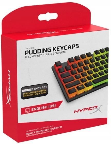 Nakładki na klawisze HyperX Pudding Keycaps są półprzezroczyste i dwuwarstwowe oraz charakteryzują się czcionką HyperX, co dodaje im blasku. Klawisze wykonane z materiału PBT formowanego dwuwarstwowo są grubsze, trwalsze i bardziej odporne na środki rozpuszczające. Zestaw klawiszy jest kompatybilny z klawiaturami HyperX oraz większością pozostałych klawiatur dla graczy i dołączono do nich narzędzie HyperX do zdejmowania nakładek, zapewniające łatwą instalację. Półprzezroczysty materiał uwydatnia podświetlenie RGBDwuwarstwowość klawiszy zapewnia większą widoczność podświetlenia, dzięki czemu oświetlenie RGB klawiatury jest jeszcze bardziej imponujące. Materiał PBT formowany dwuwarstwowoKlawisze wykonane z materiału PBT są grubsze, bardziej odporne na zużycie, tarcie czy środki rozpuszczające. Wyjątkowa czcionka HyperXNasza wyrazista, szeroka czcionka zezwala na większą widoczność podświetlenia, zwiększając czytelność poszczególnych klawiszy. W komplecie stylowe narzędzie do demontażu nakładek na klawiszeNasze narzędzie do demontażu nakładek zostało stworzone specjalnie z myślą o nakładkach HyperX. Nakładki do mechanicznych klawiatur HyperX dla graczyZestaw klawiszy jest zgodny z klawiaturami HyperX oraz większością mechanicznych klawiatur dla graczy. Uzupełniają widoczne podświetlenie LED mechanicznych przełączników klawiszy HyperX. Układ dla języka angielskiego (USA) – 104 klawisze Nakładki uwydatniają podświetlenie RGB klawiatury Półprzezroczyste nakładki z czarnym wierzchem (pudding) Nakładki pasują do mechanicznych klawiatur HyperX Numer katalogowy: HKCPXP-BK-US/G