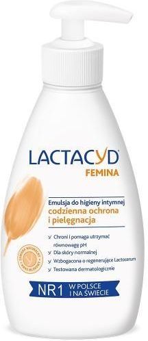 Emulsja do higieny intymnej LACTACYD FEMINA polecana jest do codziennej pielęgnacji okolic intymnych kobiet. Gwarantuje całodniowe uczucie świeżości i chroni przed uczuciem dyskomfortu i podrażnieniami.Delikatna emulsja do higieny intymnej Lactacyd Femina została stworzona, aby chronić naturalną równowagę pH okolic intymnych. Wzbogacona o naturalny kwas L-mlekowy oraz regenerujące Lactoserum odżywia i pozwala czuć się świeżo przez cały dzień, chroniąc przed uczuciem dyskomfortu. Zawiera kwas L-mlekowy, który pozwala zachować naturalną równowagę pH i chroni okolice intymne przed podrażnieniami, Dodatek Lactoserum skutecznie regeneruje i odżywia, Bezpieczny i łagodny dla okolic intymnych - nie zawiera mydła i posiada naturalne pH 5.2. Klinicznie udowodniona łagodność Wzbogacona o regenerujące Lactoserum Łagodna formuła, delikatny zapach Można stosować pod prysznicem lub w kąpieli. Do użytku zewnętrznego. Rozcieńczyć na dłoni z wodą i umyć okolice intymne. Następnie dokładnie spłukać. Do codziennego stosowania. Aqua, Magnesium Laureth Sulfate, Cocamidopropyl Betaine, Disodium Laureth Sulfosuccinate, PEG-7 Glyceryl Cocoate, Phenoxyethanol, Propylene Glycol, PEG-55 Propylene Glycol Oleate, Parfum, Lactose, Lactis Proteinum, Cocamide MEA, Laureth-10, Lactid Acid, Glyceryl Laurate, Glycol Distearate, Sodium Laureth Sulfate, 5-Bromo-5-Nitro-1,3-Dioxane, Sodium Chloride, Methylisothiazolinone, Methylchloroisothiazolinone