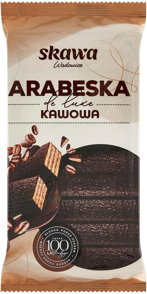 Skawa Wadowice Arabeska de Luxe Kawowa 190 g Skawa Wadowice Arabeska de Luxe Kawowa 190 g Rodzaj: Wafelki przekładane z kremem kawowym w czekoladowej polewie Opis produktu: Arabeska de Luxe Kawowa od Skawa Wadowice to klasyczne, polskie wafelki w nowoczesnym wydaniu – pokryte pyszną czekoladową polewą 🍫 i przełożone aromatycznym kremem kawowym ☕. Ich chrupiąca struktura i wyrazisty smak sprawiają, że są idealną przekąską do popołudniowej kawy, na spotkanie z przyjaciółmi lub jako elegancki dodatek do prezentu. Dlaczego warto wybrać Arabeska de Luxe Kawowa? Intensywny kawowy smak – dla fanów wyrazistych, aromatycznych słodyczy Czekoladowa polewa – dopełnienie luksusowego charakteru 🥇 Ponad 100 lat tradycji – sprawdzona receptura od polskiej marki Skawa 🎁 Eleganckie opakowanie – świetnie sprawdzi się również jako drobny upominek 🧇 Idealna tekstura – chrupiący wafel i kremowe wnętrze Zawartość opakowania: 1 x Arabeska de Luxe Kawowa 190 g – wafle z kremem kawowym oblane czekoladą Idealne dla: Miłośników kawowych smaków Do kawy, herbaty i jako słodka przekąska Na rodzinne spotkania i przyjęcia Do pracy, szkoły lub jako część prezentu 🎁 Arabeska de Luxe Kawowa – klasyka smaku w eleganckim wydaniu!