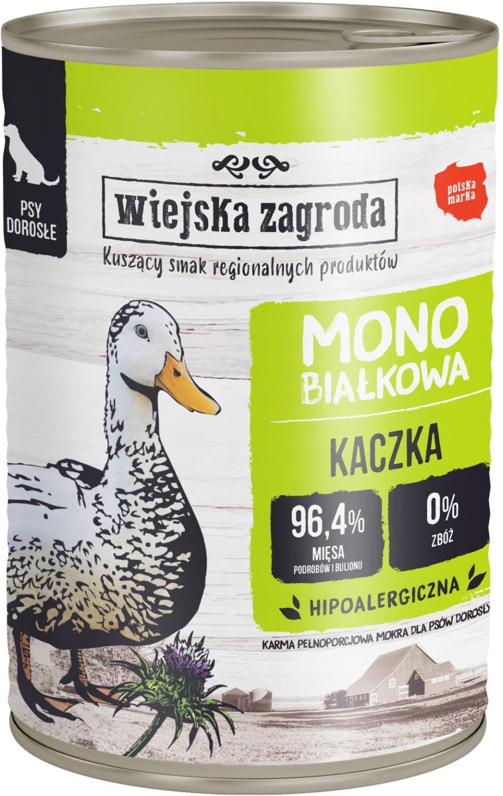 Wiejska Zagroda Monoproteina Kaczka 400G Monoproteinowa karma „Wiejska Zagroda Monoproteina Kaczka” to doskonały wybór dla psów z alergiami pokarmowymi oraz dla tych z wrażliwym układem pokarmowym. Dzięki wysokiej jakości składnikom, karma ta wspiera zdrowie, samopoczucie oraz witalność czworonogów. Odpowiednio zbilansowane pożywienie, bogate w składniki odżywcze, zapewnia psom energię do codziennych zabaw i aktywności. Analiza składu Karma „Wiejska Zagroda Monoproteina Kaczka” wyróżnia się wysoką jakością, zawierając aż 96,4% mięsa, podrobów i bulionu. Taki skład sprawia, że dostarczana porcja karmy jest pełnowartościowym źródłem białka, które jest niezbędne dla zdrowia psów. Dodatkowo, niska zawartość węglowodanów (od 7,4% do 10,1% w suchej masie) czyni tę karmę idealną dla psów, które wymagają diety bezzbożowej. Karma wzbogacona jest o witaminy i minerały, co wspiera zdrowie i kondycję pupila. Składniki Karma „Wiejska Zagroda Monoproteina Kaczka” to produkt, w którym na pierwszym miejscu znajduje się kaczka jako źródło białka. Oprócz mięsa, w składzie znajdziemy: dynia – bogata w błonnik, wspomaga zdrowie jelit i jest źródłem witamin A, C i E, olej z łososia – dostarcza nienasyconych kwasów tłuszczowych Omega-3, korzystnych dla sierści i skóry, drożdże piwne – dzięki wysokiej zawartości witamin z grupy B, poprawiają kondycję skóry i sierści, yucca Mojave – naturalny składnik, który wspiera trawienie i zmniejsza nieprzyjemny zapach odchodów, czystek – znany ze swoich właściwości przeciwpasożytniczych oraz wzmacniających odporność, spirulina – cenne źródło minerałów, witamin oraz antyoksydantów. Karma nie zawiera sztucznych barwników ani konserwantów, co sprawia, że jest odpowiednia dla psów z alergiami pokarmowymi. Rodzaj karmy „Wiejska Zagroda Monoproteina Kaczka” to mokra karma, która jest znakomitym wyborem dla dorosłych psów wszystkich ras. Taki format jest chętnie spożywany przez psy i dostarcza im dodatkowej wilgoci, co jest istotne dla ich nawodnienia. Karma jest dostępna w puszkach, co ułatwia jej przechowywanie i podawanie. Smak Kaczka to wyjątkowe źródło białka, które nie tylko jest smaczne, ale również korzystne dla psów. Monoproteinowa karma z kaczką z pewnością zaspokoi nawet najbardziej wybredne podniebienia, a jej unikalny skład sprawi, że czworonogi będą chętnie sięgać po każdy kęs. Dodatkowe cechy Karma ta oferuje szereg korzyści zdrowotnych, które mogą być decydujące w wyborze odpowiedniego jedzenia dla psa. Wśród nich warto wymienić: wsparcie zdrowia skóry i sierści – dzięki olejowi z łososia oraz drożdżom piwnym, wzmocnienie układu odpornościowego – obecność czystka i spiruliny, poprawa trawienia – dzięki zawartości dyni i yucca Mojave, redukcja zapachu odchodów – naturalne składniki wspomagające trawienie, hipoalergiczna formuła – idealna dla psów z alergiami pokarmowymi. Dzięki tak bogatemu składowi, karma nie tylko zaspokaja potrzeby żywieniowe, ale także wspiera ogólne zdrowie psa. Zalecenia dotyczące żywienia Właściwe żywienie jest kluczowe dla zdrowia każdego psa. Monoproteinowa karma dla psów powinna być wprowadzana stopniowo, zwłaszcza u psów, które wcześniej nie były karmione tego typu produktami. Rzeczywiste zapotrzebowanie na karmę może się różnić w zależności od poziomu aktywności i ogólnej kondycji zwierzaka. Obserwuj swojego pupila i dostosowuj ilość karmy, a także zapewnij mu stały dostęp do świeżej wody. Ostrzeżenia lub przeciwwskazania Zanim wprowadzisz nową karmę do diety swojego psa, warto skonsultować się z weterynarzem, szczególnie gdy zwierzę ma skłonności do alergii pokarmowych. Każdy pies jest inny i może reagować na składniki karmy w różny sposób, co podkreśla indywidualne podejście do żywienia. Choć karma jest hipoalergiczna i bezzbożowa, istnieją okoliczności, w których konkretne składniki mogą nie być wskazane, zwłaszcza w przypadku psów z problemami zdrowotnymi.