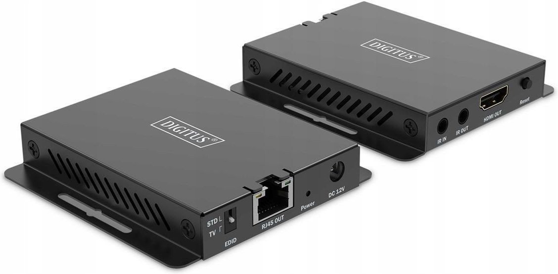 Splitter Digitus DS-55342 Zestaw Extendera HDMI DIGITUS umożliwia transmisję sygnału HDMI na odległość do 40 m (4K / 120 Hz, 4:4:4) przy użyciu kabli standardu CAT 6 lub wyższego. Zakres funkcjonalności obejmuje także dwukierunkową transmisję sygnału podczerwieni (IR), co umożliwia elastyczne sterowanie źródłem sygnału. Nadaje się również do montażu ściennego, przez co oferuje elastyczne możliwości instalacji. Transmisja sygnału HDMI (punkt-punkt) na odległość do 40 m w rozdzielczości UHD (4K / 120 Hz, 4:4:4) Dwukierunkowa transmisja sygnału podczerwieni Obsługa kabli sieciowych CAT 6, CAT 6A, CAT 7 Maks. rozdzielczość: 4K / 120 Hz (4:4:4) Przepustowość wideo: 32 Gbps Nadaje się do montażu ściennego Złącza modułu nadajnika: 1 x wejście HDMI (4K / 120 Hz) - do podłączenia źródła sygnału 1 x wyjście RJ45 do podłączenia kabla CAT do transmisji 1 x wyjście na podczerwień podłączenie przekaźnika na podczerwień 1 x wejście na sygnał podczerwieni - podłączenie od odbiornika na podczerwień 1 x wejście na zasilacz (DC 12 V / 1 A) - podłączenie zewnętrznego zasilacza 1 x rozdzielczość przełącznika (4K / 120 Hz, EDID pass through) 1 x przycisk reset 1 x kontrolka LED statusu Złącza modułu odbiornika: 1 x wyjście HDMI (4K / 120Hz) - do podłączenia wyświetlacza 1 x wejście RJ45 - do podłączenia kabla CAT do transmisji 1 x wyjście na podczerwień - podłączenie przekaźnika na podczerwień 1 x wejście na sygnał podczerwieni - podłączenie od odbiornika na podczerwień 1 x wejście na zasilacz (DC 12 V / 1 A) - podłączenie zewnętrznego zasilacza 1 x przycisk reset 1 x kontrolka LED statusu Rodzaj: Przedłużacz Zastosowanie: Audio,Wideo Złącza #1: HDMI Typ A Żeńska,RJ45 Żeńska Złącza #2: HDMI Typ A Żeńska,RJ45 Żeńska Standard: HDMI Ultra HD 4K Kolor: Czarny Wymiary: Wymiary (1 moduł): Dł. 8,4 cm x szer. 8,2 cm x wys. 1,5 cm Masa (1 moduł): 125 g Akcesoria w zestawie: 1 x moduł nadajnika 1 x moduł odbiornika 1 x nadajnik IR 1 x odbiornik sygnału podczerwieni (IR) 2 x zasilacz (12 V / 1 A, 1,2 m) 1 x skrócona instrukcja obsługi Pozostałe parametry: Obsługa szerokiego zakresu tonalnego (High Dynamic Range, HDR) Obsługa HDCP 2.3 HDMI 2.1 Temperatura robocza: 0-50° Zużycie prądu: TX (nadajnik): ok. 4 W, RX (odbiornik): ok. 3,5 W Obudowa: Metal Standard HDTV: Ultra HD 4K Kategoria okablowania: Kat. 6