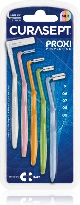 Curasept Proxi Angle Mix, 5 szt., Szczoteczki międzyzębowe dla kobiet, Szczoteczka międzyzębowa Curasept Proxi Angle Mix jest niezbędnym przyborem do higieny jamy ustnej. Dostaje się także do trudno dostępnych miejsc, zapobiegając powstawaniu próchnicy zębów. Właściwości: zadba o perfekcyjne wyczyszczenie przestrzeni międzyzębowych zapobiega zapaleniu dziąseł i nieprzyjemnemu zapachowi z ust czyści trudno dostępne miejsca w jamie ustnej gwarantuje łatwą manipulację i użycie nie podrażnia i nie uszkadza zębów ani dziąseł zmniejsza ryzyko powstania próchnicy zębów zapewnia profilaktykę paradontozy odpowiednia również dla osób z wrażliwymi zębami i dziąsłami Sposób użycia: Włóż szczoteczkę do przestrzeni międzyzębowej i wyczyść ruchem do przodu i do tyłu.