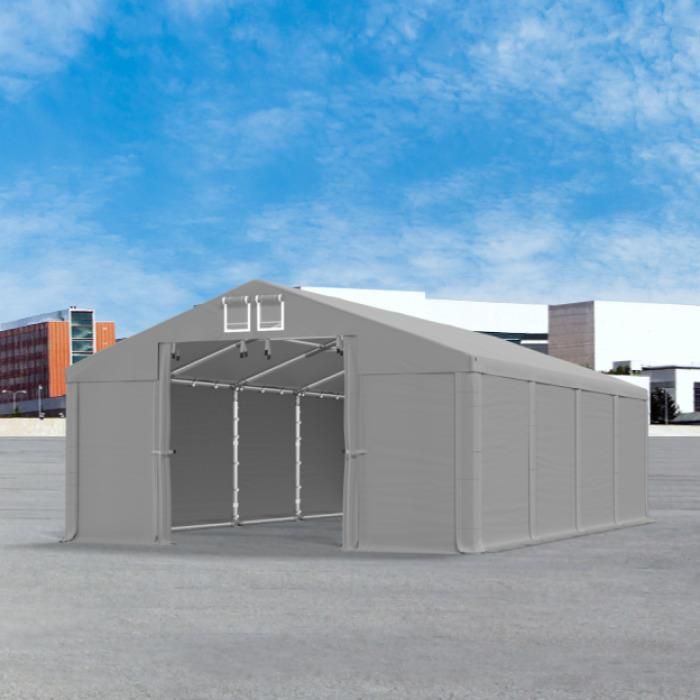 Namiot magazynowy 5x8m. Hala dostępna w kolorze białym, szarym lub zielonym. Konstrukcja namiotu stabilna do zastosowania o każdej porze roku. Namiot magazynowy 5 x 8 m może spełniać wiele funkcji, od przechowywania samochodów, czy innych pojazdów i maszyn rolniczych jako namiot garażowy. Hala zbudowana jest z mocnego i solidnego stelaża, wykonanego z ocynkowanych rur ok. fi 50 mm. Stelaż jej jest prosty w montażu. Dzięki temu oprócz szybkiego montażu, namiot można bardzo szybko przenosić tam, gdzie będzie on potrzebny. Poszycie SD Materiał poszycia PVC 4D Layer Gramatura plandeki ok. 560 g/m² Zakres temperatur od -40℃ do +60℃ Mocowanie plandeki na mocne gumki + rzepy System Hermetic (uszczelniający namiot) System Air-Control (zapobiega skraplaniu się wody) Fartuch Retencyjny (odprowadzający wodę) Odporność na UV Wodoodporność 100% Dwa wejścia/wjazdy o szerokości 2.33 m x 2.31 m wysokości System Slide and Roll (pozwala na rozsuwanie wejścia/wjazdu na boki lub zwijanie go do góry) System Over Top (wyższe wejście/wjazd niż wysokość ściany) Konstrukcja całoroczna Winter Materiał Stal ocynkowana Zabezpieczenie korozyjne ocynkiem Średnica rur konstrukcyjnych ok. 50 mm Średnica łączników ok. 54 mm Dodatkowa konstrukcja dachowa oraz podłogowa Śruby montażowe przechodzące na wylot Powiększone stopy o średnicy ok. 14 cm System Easy-Up