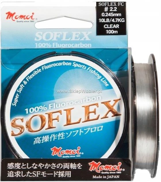 Fluorocarbon MOMOI Soflex FC 50m 0.218mm/4.0kg unikalny proces wytwarzania o nazwie MJS Processing specjalna technologia nawijania na szpule, nie powodująca naprężeń UV Block - pełne zabezpieczenie przed promieniowaniem ultrafioletowym osłabiającym żyłkę kolor przeźroczysty, szpule 50 metrów. miękki i gładki znacznie zmniejszona rozciągliwość - większa czułość Zdjęcie poglądowe.