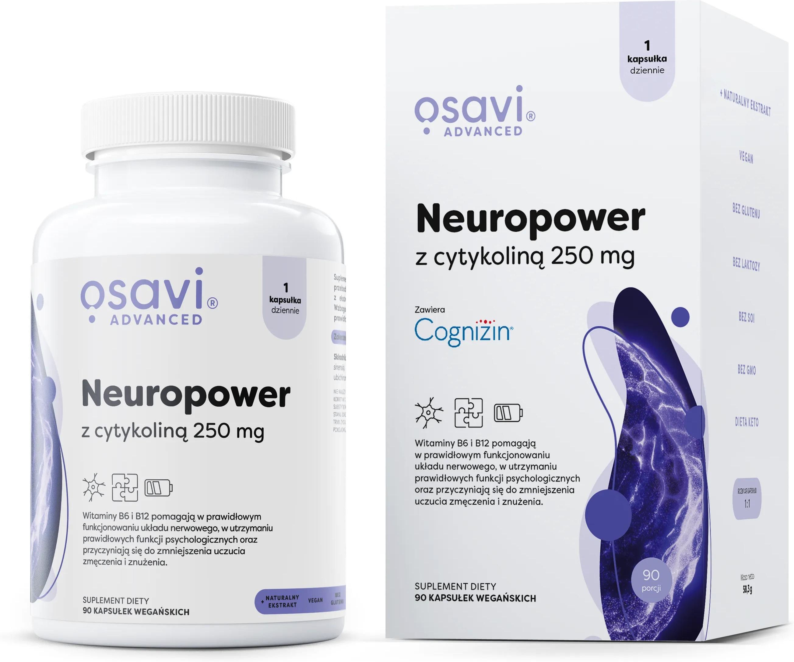 #html-body [data-pb-style=X4FNNO2]{justify-content:flex-start;display:flex;flex-direction:column;background-position:left top;background-size:cover;background-repeat:no-repeat;background-attachment:scroll}#html-body [data-pb-style=BNP7S7Q]{border-style:none}#html-body [data-pb-style=EXC4D26],#html-body [data-pb-style=P8LHTGN]{max-width:100%;height:auto}#html-body [data-pb-style=JAQ632Q]{border-style:none}#html-body [data-pb-style=BJ79RDF],#html-body [data-pb-style=MJVLCQM]{max-width:100%;height:auto}@media only screen and (max-width: 768px) { #html-body [data-pb-style=BNP7S7Q],#html-body [data-pb-style=JAQ632Q]{border-style:none} }Neuropower z cytykoliną 250 mg OSAVICytykolina to organiczny związek występujący w organizmie, będący prekursorem fosfatydylocholiny – jednego z głównych składników błon komórkowych. Suplement diety Neuropower z cytykoliną 250 mg OSAVI uzupełnia codzienną dietę o ten składnik oraz o witaminy B6 i B12, które pełnią istotne funkcje metaboliczne i wspierają organizm w okresach zwiększonego zapotrzebowania. Witamina B6 przyczynia się do utrzymania prawidłowego metabolizmu energetycznego oraz pomaga w regulacji aktywności hormonalnej. Natomiast witamina B12 odgrywa kluczową rolę w funkcjonowaniu układu nerwowego oraz bierze udział w produkcji czerwonych krwinek. Obydwie witaminy wspomagają również zmniejszenie uczucia zmęczenia i znużenia.Wegańska formuła dla Twojego komfortuProdukt został opracowany z myślą o osobach preferujących dietę roślinną. Wegańskie kapsułki zapewniają wygodę stosowania bez kompromisów dotyczących wartości etycznych. Dodatkowo, brak składników pochodzenia zwierzęcego minimalizuje ryzyko reakcji alergicznych, co czyni Neuropower odpowiednim wyborem dla osób z różnorodnymi potrzebami dietetycznymi. Czy jesteś gotowy, by odkryć pełen potencjał swojego umysłu z Neuropower z cytykoliną 250 mg? Zawiera w porcji: 1 kapsułka (% RWS*) Cognizin® Cytykolina 250 mg - Ekstrakt z liści zielonej herbaty (Camellia sinensis), DER 480:1, 204 mg - standaryzowany na min. 98% L-teaniny 200 mg - Koenzym Q10 (ubichinon) 25 mg - Witamina B6 (chlorowodorek pirydoksyny) 6 mg (429 %) Witamina B12 (metylokobalamina) 100 μg (4000 %) *RWS - referencyjna wartość spożycia