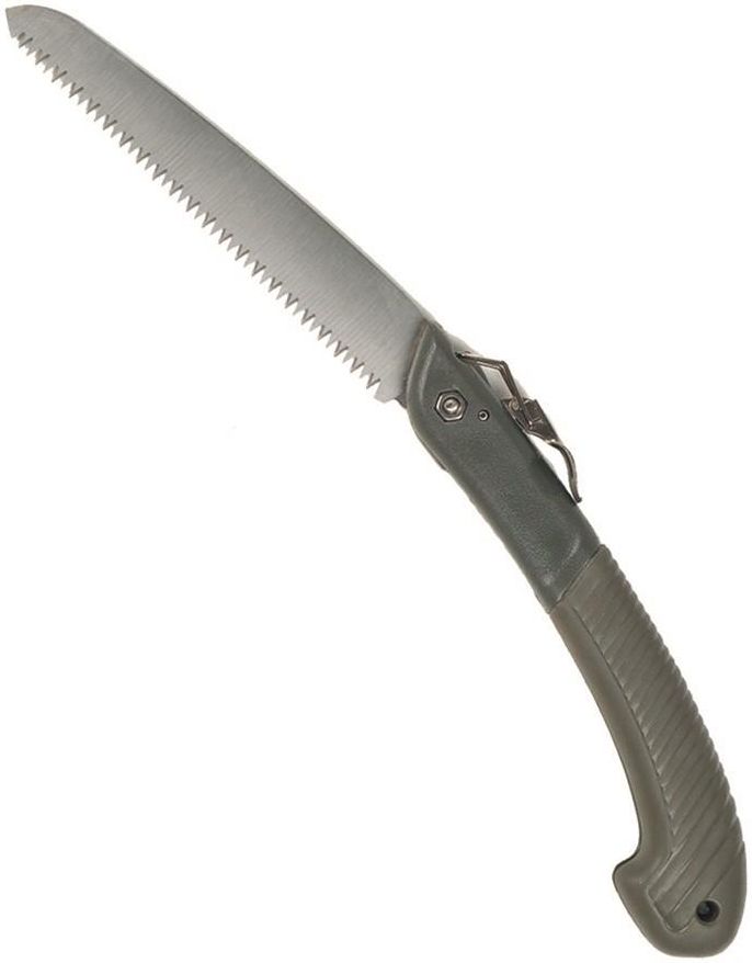 Piła składana Carbon Steel 180mm dwa rzędy zębów stal węglowa Olive [15503000] Najważniejsze cechy produktu Model: Piła składana Carbon Steel Materiał: ostrze – stal węglowa, rękojeść – tworzywo Typ zębów: XT (7 zębów na 1 cal), 2 rzędy Antypoślizgowa rękojeść Blokada zamknięcia Kolor: Oliv Zalety Wysoka jakość Niewielkie rozmiary Solidne ostrze z dwoma rzędami zębów Ergonomiczna, antypoślizgowa rękojeść Blokada zabezpieczająca przed mimowolnym złożeniem Zapewnia komfort użytkowania i efektywną pracę Dane techniczne Producent: Mil-Tec, Niemcy Stal: węglowa Rękojeść: tworzywo sztuczne Długość głowni: 180 mm Grubość głowni: 2 mm Długość po złożeniu: 270 mm Długość całkowita: 400 mm Waga: 204 g Poręczna piła składana wyposażona w ostrze wykonane z wytrzymałej stali węglowej. Dwurzędowy układów zębów typu XT (7 zębów na 1 cal) przeznaczone są do cięcia drewna oraz tworzywa sztucznego. Piła sprawdzi się podczas przygotowywania obozowiska na wyprawie survivalowej, wyjeździe bushcraftowym, na wyprawie turystycznej czy podczas prac w przydomowym ogrodzie lub na działce. Brzeszczot o długości 180 mm wykonano ze stali węglowej, która charakteryzuje się wysoką odpornością na wykruszanie i pęknięcia. W pozycji otwartej piła blokowana jest solidną stalową klamrą. Ergonomicznie wyprofilowana rękojeść o długości 23,7 cm wyposażona została w antypoślizgowe nacięcia, co przekłada się na bezpieczną pracę z narzędziem. Na końcu chwytu znajduje się otwór umożliwiający przewleczenie linki zabezpieczającej.
