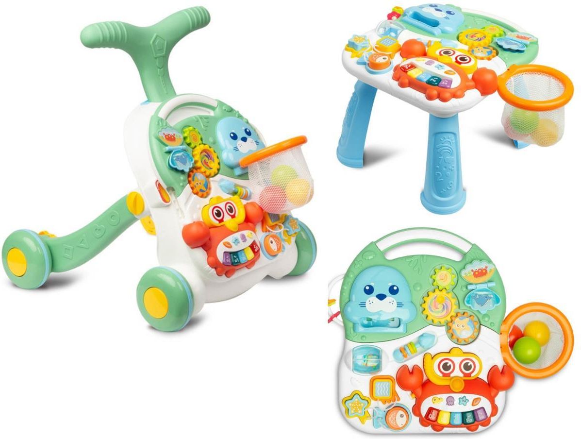 Interaktywny Pchacz Chodzik Jeździk Stoliczek Spark Rozwój i Zabawa dla dziecka turkusowy PCHACZ-STOLIK 2 W 1 SPARK GREEN Ciesz się doskonałą zabawą i edukacją Twojego dziecka dzięki interaktywnemu pchaczowi i stoliczkowi Spark. Ta innowacyjna zabawka z linii TOYZ Activity świetnie sprawdzi się dla małych odkrywców, którzy już zaczęli stawiać pierwsze kroki. Dzięki wielu funkcjom i atrakcjom maluch będzie można zapewnić długie godziny zabawy i rozwijania umiejętności. Spark to nie tylko pchacz, ale także interaktywny stoliczek z mnóstwem atrakcji. Wyposażony w koszyczek, do którego dziecko może wrzucać 3 plastikowe piłeczki z grzechotką, zapewniający rozrywkę i rozwijanie zmysłów. Dodatkowo, zabawka posiada wyciągane pianinko w kształcie kraba, aktywne zębatki, które się kręcą oraz wiele innych niespodzianek, które uprzyjemnią czas zabawy maluchowi. Stabilna i solidna konstrukcja zapewniająca bezpieczną i długotrwałą zabawę. Zachęca do chodzenia, utrzymywania równowagi i ćwiczeń, wspomagając rozwój motoryczny. Liczne kolorowe zabawki stymulują rozwój intelektualny i sensoryczny malucha. Wyciągane pianinko na baterie z 5 przyciskami umożliwia maluchowi odkrywanie dźwięków i muzyki. Ponadto, Spark to innowacyjna zabawka 2 w 1 - pchacz oraz stoliczek do zabawy. Wysokość kierownicy można regulować na dwa różne poziomy, co umożliwia dostosowanie zabawki do wzrostu dziecka. Tylne kółka z blokadą zapewniają stabilność i bezpieczeństwo. Spark spełnia wszystkie normy bezpieczeństwa EN 71 oraz EN 62115, dzięki czemu możesz mieć pewność, że to bezpieczna zabawka dla Twojego dziecka. Wymiary pchacza wynoszą 47x44x48 cm, a stoliczka: 33x37x24 cm. Zabawka waży 2,65 kg, a jej opakowanie ma wymiary: 68x11x39 cm. Spark jest odpowiedni dla dzieci od 12 miesiąca życia, zapewniając radość, naukę i rozwój w kolorowej i interaktywnej formie. ZAPRASZAMY NA POZOSTAŁE AUKCJE.