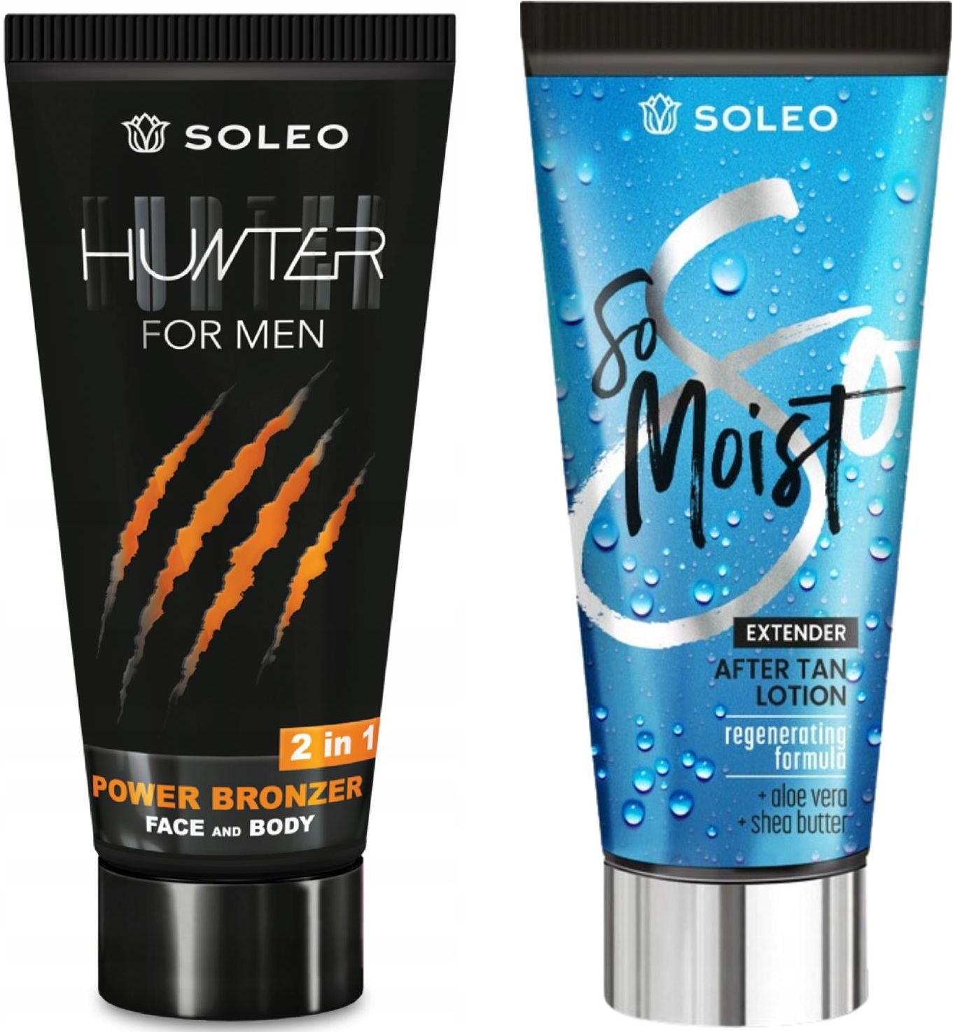 Soleo Hunter + So Moist Po Opalaniu GratisSoleo Hunter Bronzer Dla Mężczyzn Tuba 150mlBalsam brązujący do opalania twarzy i ciała. Doskonały dla wymagającej męskiej skóry, ponieważ zapewnia brązowienie skóry bez promieni UV.Soleo Hunter dla mężczyzn:Wspomaga powstawanie szybkiego efektu i naturalnego koloruNie pozostawia smug i zaciekówSzybko się wchłaniaGłęboko nawilżaZapach: wild forestPojemność: 150mlSposób użycia:Bezpośrednio przed opalaniem nanieś równomierną warstwę na całą powierzchnię ciała. Po aplikacji, umyj dokładnie ręce! Pamiętaj, że produkt przeznaczony jest wyłącznie do użytku zewnętrznego. Aby skutecznie wzmacniać i zachować na opaleniznę dłużej używaj każdorazowo przed wizytą w solarium.Soleo So Moist Balsam Do Całego Ciała Po Opalaniu 150mlSo Moist to balsam przedłużający opaleniznę do codziennej pielęgnacji ciała. Specjalna regenerująca formuła intensywnie nawilża opaloną skórę. Dba o piękny blask i aksamitną miękkość.Ciesz się piękną opalenizną i zdrową skórą znacznie dłużej!Składniki aktywne: aloes, masło shea, olej szafranowy, witaminy B3, B6 ,hydrolizowane proteiny roślinneZapach: aqua kissBalsam Soleo So Moist rekomendowany dla: wszystkich osób opalających się solarium i na słońcu, po opalaniuSposób użycia:Równomierną ilość eliksiru rozprowadź na skórze całego ciała. Stosuj produkt po opalaniu, ale także jako codzienną pielęgnacją przeciwstarzeniową i kondycjonującą skórę. Możesz stosować produkt nawet dwa razy dziennie, według potrzeb i uznania.