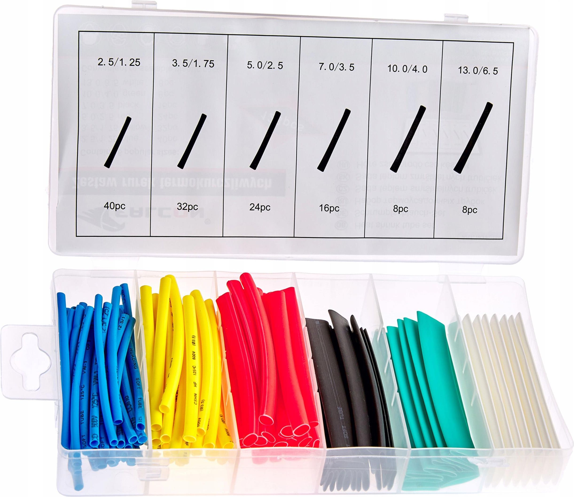 ZESTAW RUREK TERMOKURCZLIWYCH KOLOROWE 128 sztuk kod: V09023 Rurki termokurczliwe wykonane są z poliolefin (m.in. z polietylenu) sieciowanych radiacyjnie. Doskonale izolują i uszczelniają. Tworzą warstwę ochronną, antykorozyjną i dekoracyjną. ZASTOSOWANIE: Chronią przewody przed korozją atmosferyczną i ziemną. Maja wysoka odporność na zmienne warunki atmosferyczne. Chronią przed wilgocią. Przyjmują kształt przedmiotu, na którym są obkurczane Zwiększają jego ochronę mechaniczną. Wystarczy połączyć przewody, założyć koszulkę i podgrzać zapalniczką, bądź opalarką. Koszulka po tej operacji zmniejszy się maksymalnie o połowę swojej objętości.