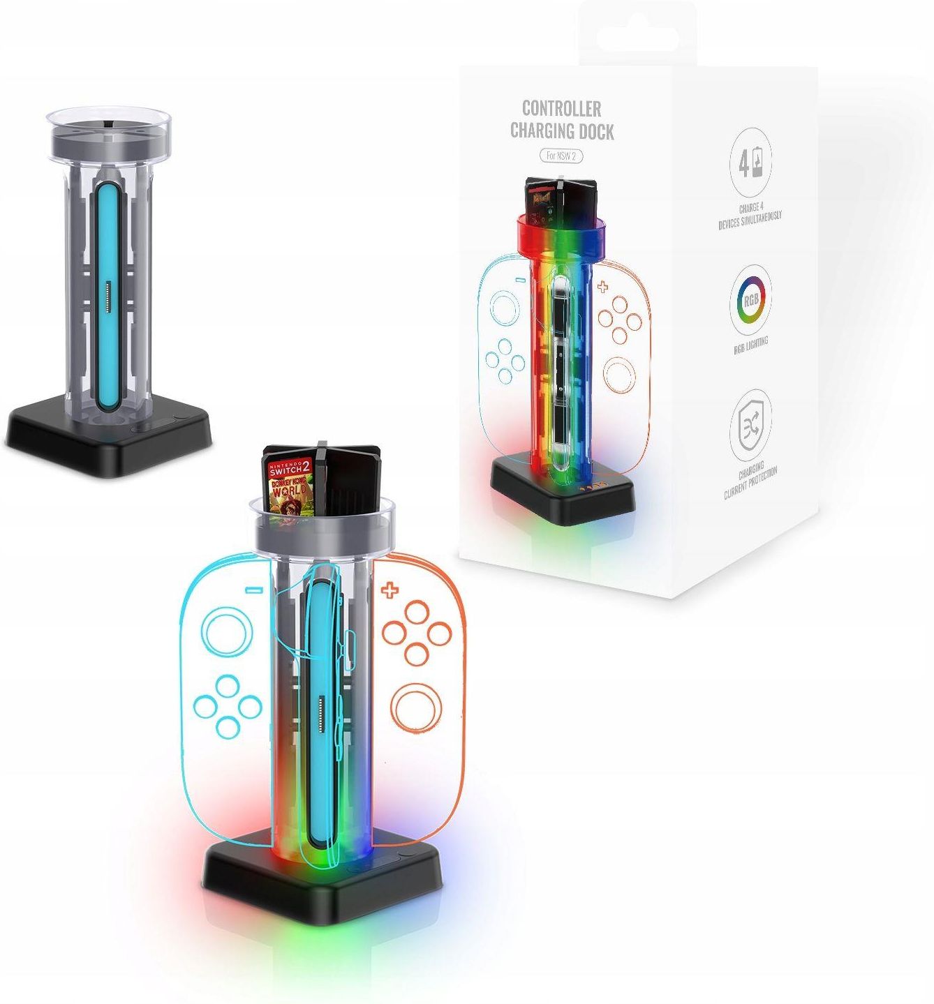 ?Stacja Ładująca do 4 kontrolerów Joy-Con ?Z organizerem / uchwytem na 6 kart z grami ?2w1 ? Do Nintendo Switch 2 / NSW 2 ? Podświetlenie RGB Ładowanie do 4 kontrolerów jednocześnie – idealne dla kilku graczy, wszyscy gotowi do gry w tym samym czasie Pełne ładowanie 4 Joy-Conów w około 2,5 godziny …
