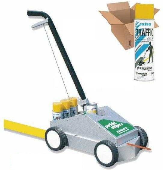 Zestaw ampere farba drogowa Traffic 12szt z wózkiem Perfekt Striper do malowania pasów Farba Traffic Ampere to specjalna farba do trwałego znakowania podłoża z wysoką zawartością pigmentu (wzmocniony kolor), szybkoschnąca, odporna na działanie chemikaliów. Spray przeznaczony do znakowania/malowania dróg, ulic – znaków na jezdni, linii, parkingów, pasów, powierzchni magazynowych. Odporna na ścieranie, warunki atmosferyczne, wycieki paliwa, intensywny ruch. 1 puszka pozwala nam namalować linie o długości min. 40m.b. (przy chropowatej powierzchni oraz szerokości linii ok. 10cm). Farba bez chlorofluorowęglowodoru i ołowiu. Zawartość puszki 500ml. Dostępne kolory Żółty Niebieski Czerwony Czarny Biały Zielony Szary (na zamówienie) Wózek Perfekt Striper do malowania linii o szerokości od 5 do 10 cm. Posiada on: funkcjonalny uchwyt z przyciskiem, stojak boczny, który pozwoli na znakowanie wzdłuż ścian, palet czy maszyn, półkę, na której zmieszczą się trzy spraye. Wózek posiada szerokie koła co sprawia, że znakowanie linii staje się bardziej stabilne i precyzyjne. Puszka farby TRAFFIC samoczynnie przyjmuje właściwą pozycję dopasowując się w uchwycie. Po dokonaniu zakupu proszę o podanie koloru farb. Zapytaj o większą ilość tel. +48 56 306 61 01
