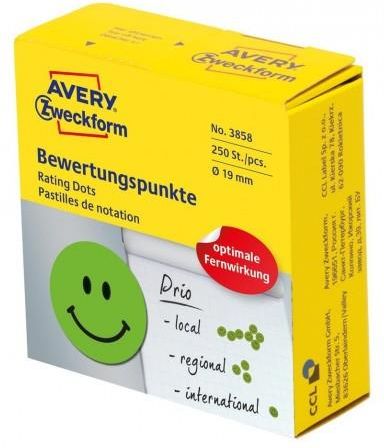 Etykiety kółka uśmiechnięta buźka Avery Zweckform, Ø 19 mm, rolka 250 sztuk, trwałe, zielone, 3858 Zielone, samoprzylepne kółka do oceny 3859 z wesołą buźką (Ø 19 mm) od AVERY ZWECKFORM, łatwe w użyciu dzięki praktycznemu dyspenserowi. Idealne do głosowania, oceniania i oznaczania. Poręczne opakowanie zawiera 250 okrągłych naklejek do wyrażania pozytywnej opinii. Dyspenser automatycznie podaje kolejną naklejkę z rolki, dzięki czemu jest łatwy w obsłudze i gwarantuje bezpieczne przechowywanie etykiet. Specyfikacja: wymiary: Ø 19 mm, zawartość: 250 Etykiet / 1 rolka rodzaj kleju: trwałe przyleganie kolor: zielony wykonany z: papier kształt: okrągły wymiary: dyspenser przyjazny dla środowiska: Made in Germany, bez PVC, bielony bezchlorowo