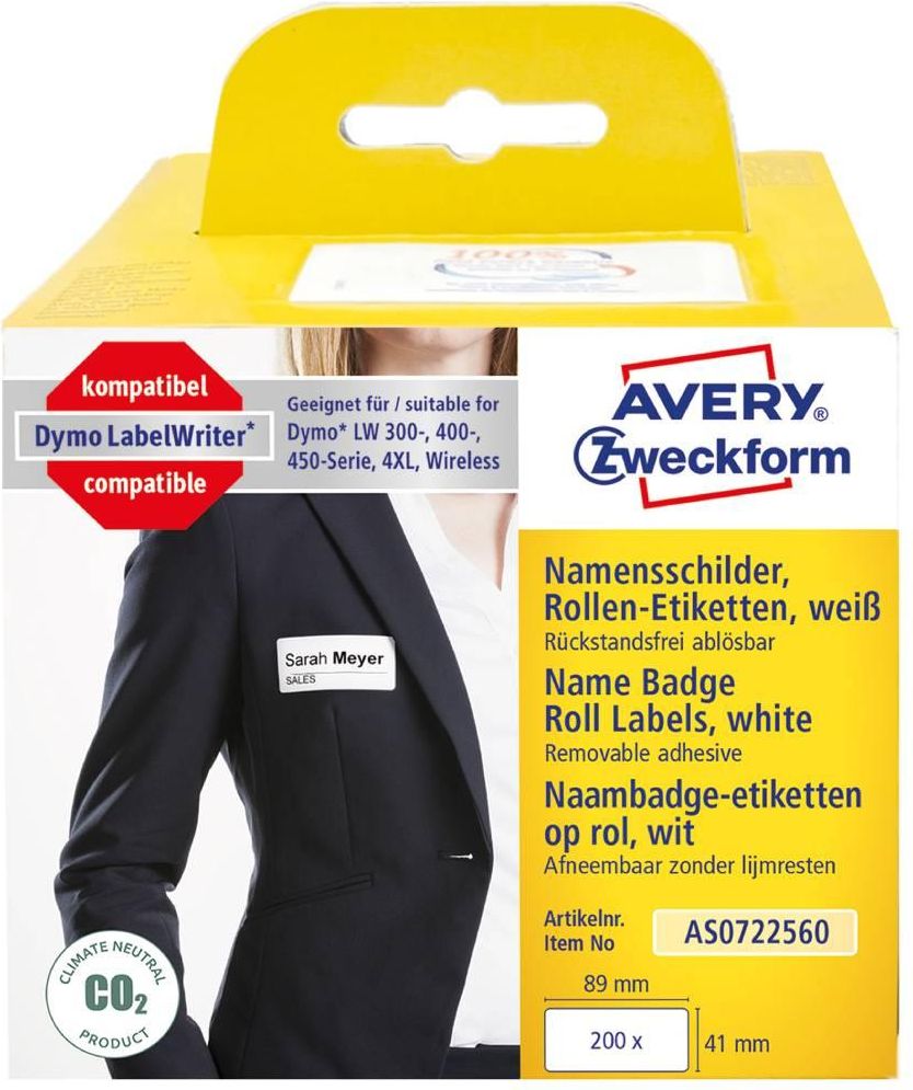 Identyfikatory imienne Avery Zweckform w rolce do drukarek termicznych, 200etyk./1rolka, 41 x 89 mm, usuwalne, białe • Identyfikatory imienne Avery Zweckform w rolce do drukarek termicznych • Są w 100% kompatybilne z: Dymo LW310; Dymo LW330T, LW400 Seria, LW450 Seria; Brother TD-4100N • Rozmiar: 41 x 89 mm • Klej: usuwalny • 1 rolka/op. • 200 etykiet/rolka • Kolor: białe • Praktyczne i ekonomiczne rozwiązanie na spotkania i konferencje firmowe • Wykonane z elastycznego materiału - pewnie przylegają do ubrań i dają się łatwo usunąć nie pozostawiając śladów AS0722560