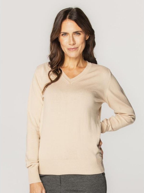 Sweter damski z dekoltem V-neck Sweter damski z najnowszej kolekcji Willsoor. Doskonały zarówno na ciepłe jak i chłodne dni. Dobrze komponuje się z koszulami damskimi Willsoor. Typ: szpic (V-neck) Kolor: beżowy, gładka faktura Skład: 100% bawełna Jakość: pierwsza Uszyty w Polsce