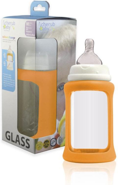 Szklane butelki do karmienia Cherub Baby z silikonowym termoaktywnym uchwytem łączą higienę, ekologię, bezpieczeństwo i zdrowie. Silikonowy uchwyt zabezpiecza butelkę, ułatwia trzymanie i zmienia kolor, gdy temperatura pokarmu przekracza 42°C chroniąc Twoje dziecko przed oparzeniem. Do zestawu dołączony jest perystaltyczny smoczek o kształcie imitującym brodawkę. Smoczek posiada system anty-kolkowy, dzięki któremu powietrze dostaje się do wnętrza butelki redukując podciśnienie i dając dziecku więcej komfortu podczas karmienia. Do zastawu dokupić można praktyczny uchwyt dla starszych dzieci. Wszystkie elementy wykonano z bezpiecznych materiałów wolnych od: ftalanów, bis fenolu A, PVC, poliwęglanów. Smoczek (w zestawie): perystatlyczny anatomiczny kształt, posiada system antykolkowy, umożliwiający powietrzu dostanie się do wnętrza butelki podczas karmienia, w zestawie smoczek średnioprzepływowy 3+, dostępne również inne rozmiary, smoczek wykonany został z miękkiego silikonu, wolnego od: ftalanów, bis fenolu A, PVC, poliwęglanów. Silikonowy uchwyt (w zestawie): zmienia kolor na biały, gdy pokarm wewnątrz jest zbyt ciepły, wykonany z bezpiecznego materiału, wolnego od: ftalanów, bis fenolu A, PVC, poliwęglanów. Szklana butelka Cherub Baby: nie matowieje, łatwo utrzymać ją w czystości, butelka wykonana jest z wytrzymałego hartowanego szkła borokrzemianowego - odpornego na uszkodzenia i wysoką temperaturę, można ją bezpiecznie sterylizować i myć w zmywarce, posiada standardowy gwint, który pasuje do większości smoczków, szkło nie reaguje z żywnością, szkło jest materiałem ekologicznym, dostępna w 2 pojemnościach: 150 i 240 ml, zakrętka podróżna – w zestawie.