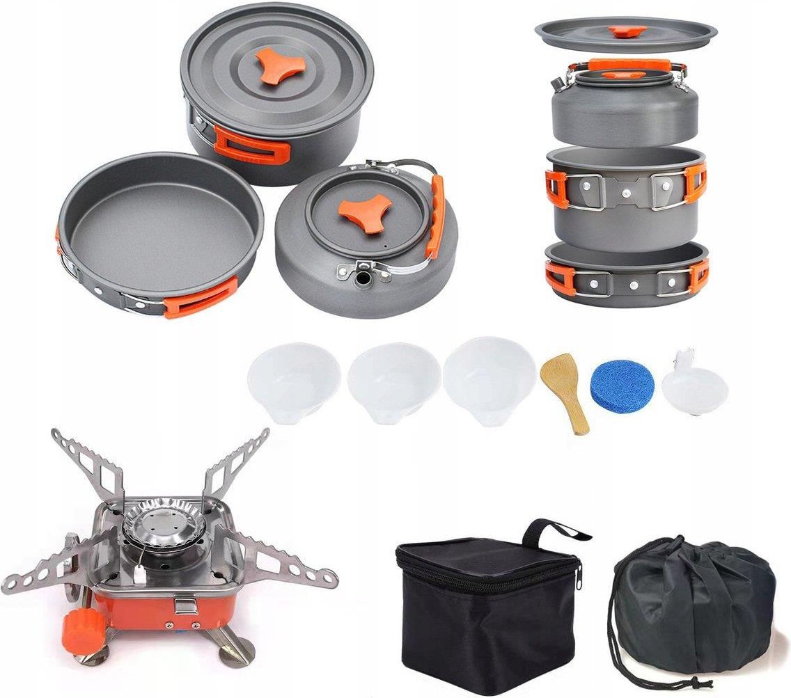 PREZENTUJEMY ŚWIETNY ZESTAW TURYSTYCZNY SKŁADAJĄCY SIĘ Z GARNKA, PATELNI, CZAJNIKA, POKRYWKI, 3 MISECZEK, CHOCHLI, GĄBKI, DREWNIANEJ ŁYŻKI ORAZ POKROWCA + DODATKOWO W ZESTAWIE KUCHENKA GAZOWA TURYSTYCZNA POLOWA MINI Z POKROWCEM NA ZAMEK Komplet świetnie sprawdzi się na wyprawie, kempingu, pod …