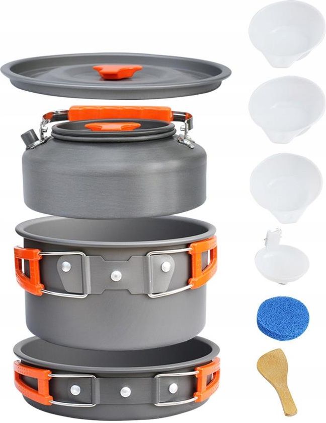 PREZENTUJEMY ŚWIETNY ZESTAW TURYSTYCZNY SKŁADAJĄCY SIĘ Z GARNKA, PATELNI, CZAJNIKA, POKRYWKI, 3 MISECZEK, CHOCHLI, GĄBKI, DREWNIANEJ ŁYŻKI ORAZ POKROWCA Komplet świetnie sprawdzi się na wyprawie, kempingu, pod namiotem, na rybach i na każdym innym wyjeździe. Z dala od cywilizacji ugotujesz wodę lub przygotujesz obiad. Zestaw posiada składane uchwyty i specjalnie zaprojektowaną konstrukcję która składa się w jedno większe naczynie i zajmuje mało miejsca! Nasz zestaw to aż 10 niezbędnych elementów potrzebnych każdemu turyście: garnek, patelnia, czajnik, pokrywka, czyścik, drewniana łyżka, plastikowa składana chochelka, oraz 3 plastikowe miseczki do jedzenia. Wykonane z wysokiej jakości aluminium jest wytrzymałe i lekkie. Garnek, patelnia oraz chochla posiadają składane rączki Garnek, patelnia, czajnik oraz przykrywka zostały wykonane z aluminium anodyzowanego oraz posiadają specjalną powłokę, dzięki której jedzenie nie przywiera. Cały zestaw składa się w jedną całość, dzięki czemu zajmuje bardzo mało miejsca. Zestaw przeznaczony jest dla 1 - 3 osób. Dzięki dołączonemu w zestawie zmywakowi naczynia bardzo łatwo umyjesz i będą gotowe do kolejnego użycia. Wykończenia w kolorze pomarańczowym. Zestaw naczyń turystycznych, który przyda się na każdym campingu i wycieczce. Składa się z 10 części i pokrowca do przenoszenia: garnek pokrywka patelnia czajnik drewniana łyżka plastikowa chochla 3 x miska zmywak pokrowiec ZESTAW PRZYDATNY W KAŻDEJ SYTUACJI Nasz zestaw świetnie sprawdzi się w wielu sytuacjach i podróżach. Zarówno podczas wakacji, kempingów, wypadów w góry jak i pod namioty czy ogrodzie. WYMIARY ZESTAWU: PATELNIA: średnica: 15,5 cm wysokość: 4 cm GARNEK: średnica: 15,2 cm wysokość: 7 cm pojemność garnka: 0,75 l POZOSTAŁE: średnica miseczek: 11,5 cm średnica chochelki: 8 cm długość łyżki: 14 cm szerokość łyżki: 5 cm wysokość całego zestawu po złożeniu: ok. 9 cm SKŁADANE RĄCZKI Zestaw posiada składane wygodne rączki, dzięki czemu możemy bezpiecznie gotować bez obaw o poparzenie, a po skończonym gotowaniu wygodnie złożyć rączki i schować zestaw do pokrowca!