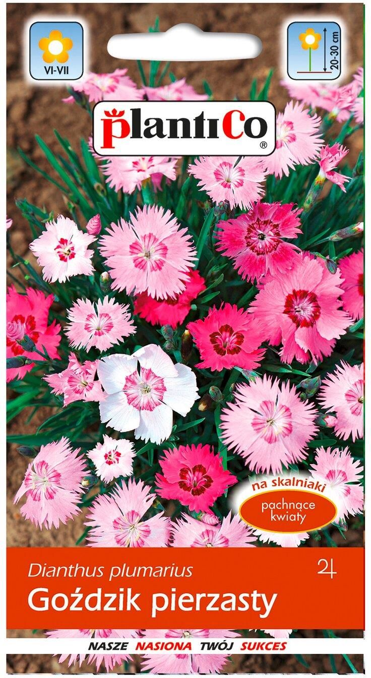 Nasiona kwiatów PlantiCo. Goździk pierzasty, mieszanka kolorów. Tworzy gęste poduszki z silnie pachnącymi kwiatami, wysokości 20-30cm. Roślina wieloletnia, bylina. Wysiew nasion w V- VI do inspektu lub na rozsadnik, wymaga pikowania, na miejsce stałe wysadzamy w sierpień- wrzesień. Wymaga gleb suchych i stanowiska słonecznego.