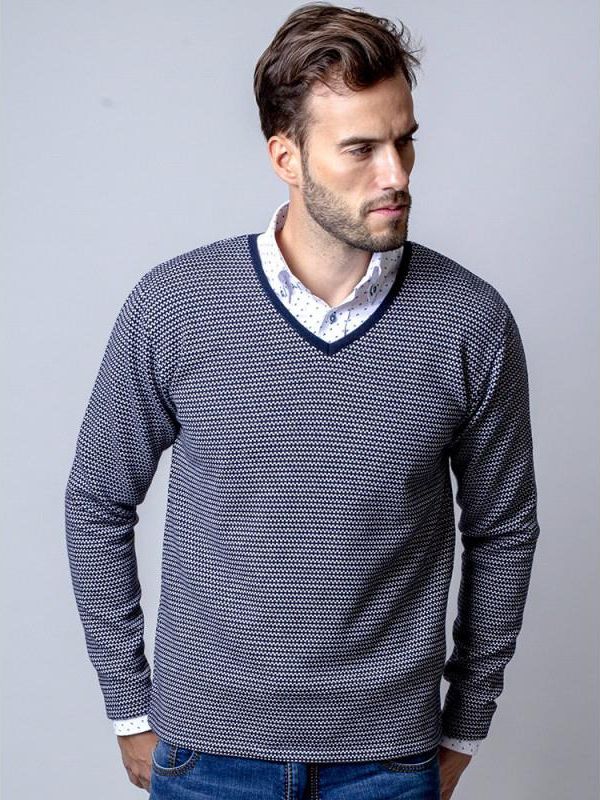 Sweter męski Willsoor Kolor: granatowo-biały wzór Dekolt: szpic (typ V-neck) Skład: 48% bawełna, 37% sztuczny jedwab, 15% nylon Rękawy z mankietami bez ściągacza Dół bez ściągacza Elastyczna tkanina, prosty fason Jakość: pierwsza Gwarancja: 24 m-ce Uszyty w Polsce
