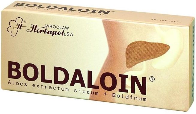 Boldaloin 30 tabletek Wskazania:  tradycyjnie w niestrawności z uczuciem pełności w jamie brzusznej, zaburzeniach wydzielania żółci i soku żołądkowego, w lekkich skurczowych zaburzeniach żołądkowo-jelitowych. Tradycyjnie w regulacji częstości wypróżnień (w łagodnych zaparciach związanych ze zmianą diety, miejsca pobytu). Skład:  1 tabletka zawiera: aloes extractum siccum (2:1), ekstrahent: woda oczyszczona 23,6mg, boldinum 1,0mg oraz substancje pomocnicze: skrobia ziemniaczana, sacharoza, guma arabska, glicerol, talk, magnezu stearynian. Działanie:  żółciotwórcze, rozkurczowe, przeczyszczające oraz ochronne na wątrobę. Zwiększa również produkcję kwasu solnego w żołądku. Dawkowanie:  jako preparat źółciopędny i pobudzający wydzielanie soków żołądkowych: dorosłym doustnie 3 razy dziennie po 1 tabletce, dzieciom powyżej 12 roku życia i osobom w podeszłym wieku od 1 do 2 tabletek dziennie. Jako łagodny środek regulujący wypróżnienia od 1 do 3 tabletek jednorazowo, wieczorem. Przeciwwskazania:  ostre stany zapalne dróg żółciowych, kolka wątrobowa, ostre stany zapalne jelit i trzustki, czynna choroba wrzodowa, krwawienia wewnętrzne, końcowy okres ciąży i okres karmienia piersią. Dzieci do 12 roku życia.