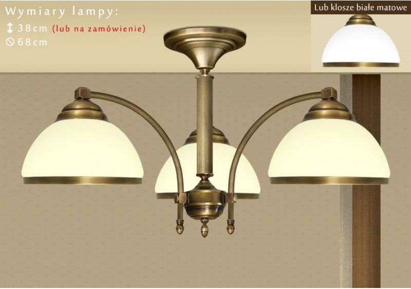 Żyrandol mosiężny. - Wykonany w całości z elementów z pełnego mosiądzu. - Wykończenie: złota patyna. - Klosze szklane kremowe matowe lub białe matowe z ramką mosiężną (albo klosze białe połysk w niżej cenie - zobacz inne lampy z serii R). - Możliwość podłączenia lampy na dwa obwody (1 + 2 źródła światła) lub na jeden obwód (3 źródła światła). - Wymiary całkowite: wysokość 38cm (lub inna na zamówienie), średnica 68cm, średnica kloszy 19cm.- Typ mocowania: wspornik (montowany do sufitu na dwóch wkrętach) - Żródło światła: 3xE27 (żarówki tradycyjne/żarowe o mocy max. 60W) lub żarówki energooszczędne albo LED o większej mocy (np. odpowiednik 100W). Lampa jest fabrycznie nowa, wyprodukowana w Polsce. Gwarancja: 24 miesiące. Seria R - zobacz wszystkie lampy