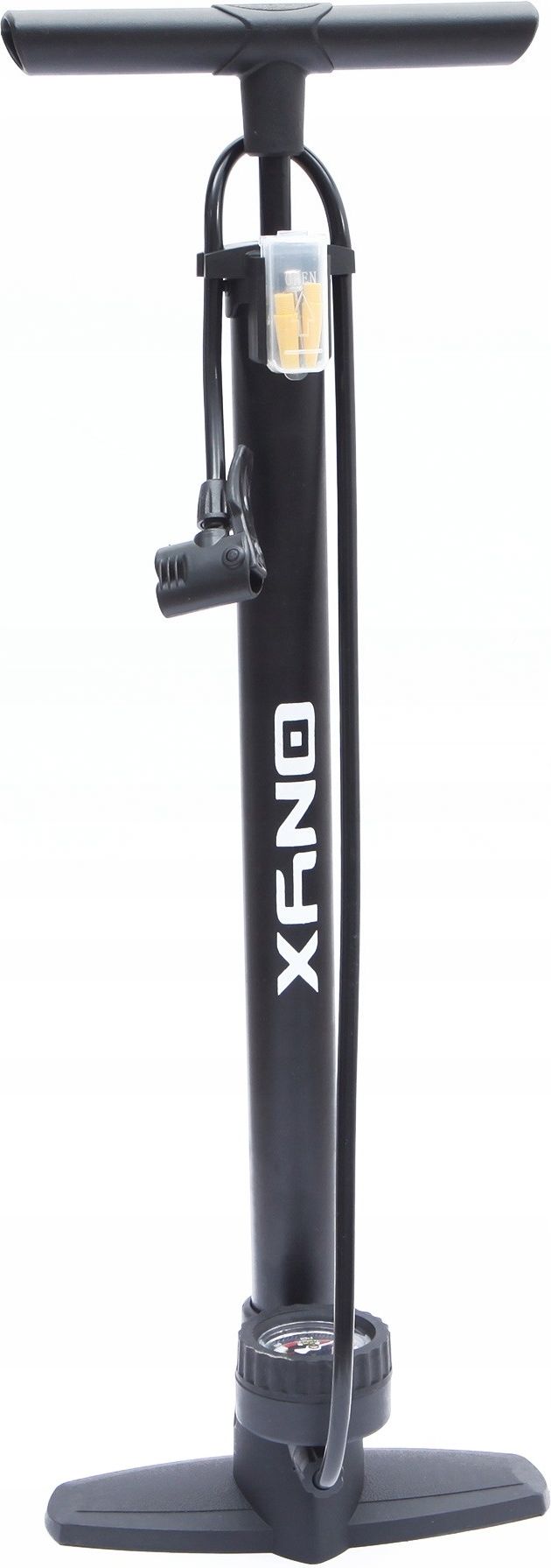 Pompka podłogowa ONYX z manometrem – uniwersalne zastosowanie Pompka podłogowa ONYX z wbudowanym manometrem umożliwia szybkie i precyzyjne pompowanie opon rowerowych, samochodowych, motocyklowych oraz piłek i innych akcesoriów. Wykonana z najlepszych materiałów gwarantuje uzyskanie wysokiego ciśnienia, czytelny wskaźnik zapewnia uzyskanie zakładanego ciśnienia, dodatkowe akcesoria umożliwiają jej zastosowanie w pompowaniu innych akcesoriów takich jak piłki, materace itp. NAJWAŻNIEJSZE CECHY MANOMETR W ZESTAWIE – Precyzyjny pomiar ciśnienia w czasie rzeczywistym. DO WIELU TYPÓW ZAWORÓW – Pasuje do Presta, Schrader, Dunlop. WYSOKIE CIŚNIENIE ROBOCZE – Do 11 BAR / 160 PSI. STABILNA PODSTAWA – Antypoślizgowa stopa dla bezpiecznego pompowania. TRWAŁA KONSTRUKCJA – Metalowy cylinder i wzmocniony tłok. WYGODNY UCHWYT – Ergonomiczna rączka dla lepszej kontroli. DODATKOWE KOŃCÓWKI W KOMPLECIE – Do piłek, materacy i zabawek. WSZECHSTRONNE ZASTOSOWANIE – Do roweru, auta, motocykla i nie tylko. SPECYFIKACJA Minimalna wysokość: 65 cm Maksymalna wysokość: 105 cm Średnica: 35 mm Długość węża: 80 cm Wymiary podstawy: 16 x 16 cm Materiał: tworzywo sztuczne, aluminium Manometr: tak – analogowy, wbudowany Ciśnienie maksymalne: 11 BAR (160 PSI) Końcówki dodatkowe: do piłek, materacy, zabawek PRECYZYJNY POMIAR CIŚNIENIA Wbudowany manometr pokazuje aktualne ciśnienie podczas pompowania, co pozwala uniknąć niedopompowania lub przepompowania opony ZESTAW DODATKOWYCH KOŃCÓWEK W komplecie znajdują się uniwersalne końcówki do pompowania piłek, materacy i innych dmuchanych akcesoriów