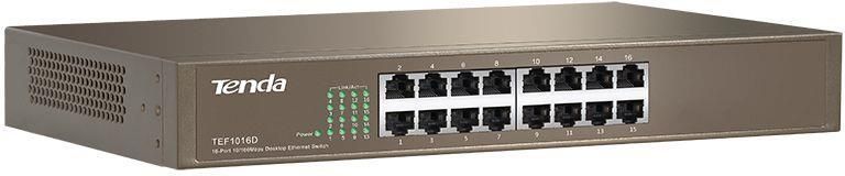 TEF1016D 10/100 16 portów został zaprojektowany jako proste i opłacalne rozwiązanie dla rozbudowy sieci MŚP i na kampusach. Podłącz urządzenie do routera i dodaj do dwudziestu trzech innych komputerów lub inne urządzenia takie, jak drukarka, przyłączana sieciowo pamięć masowa (NAS), kamera internetowa etc., aby zwiększyć funkcjonalność swojej sieci. Wytrzymała metalowa obudowa zagwarantuje lata niezawodnego użytkowania. Proste i opłacalne rozwiązanie dla rozbudowy sieci MŚP i na kampusach Kluczowe cechy 16 portów 10/10/100 Mb/s autosensing z auto detekcją crossover MDI/MDI-X Do 200 Mb/s przepustowości full duplex na każdym porcie Wytrzymała metalowa obudowa zagwarantuje Tobie lata niezawodnego użytkowania. 8K wpisów adresów MAC; automatyczna nauka oraz postarzanie adresów; kontrola przepływu dla poprawy jakości transmisji danych Zasilanie z profesjonalnym zabezpieczeniem przed piorunami 6000 V Do zamontowania na standardowym stojaku 13/19 cali Plug and play, brak konieczności dodatkowej konfiguracji. Oszczędzający miejsce design - możliwość instalacji na biurku lub na stojaku Szybkość 100 Mb/s oraz przepustowość przełączania do 3.2 Gb/s i nieprzerwane przesyłanie z dużą prędkością sprostają wymaganiom szybkiej i sprawnej sieci. Zgodność ze standardami i protokołami W pełni kompatybilny ze standardami IEEE 802.3 10BASE-T, IEEE 802.3u 100BASE-TX. Świetna wydajność i niezawodność To urządzenie Plug and Play i nie wymaga żadnej konfiguracji ani dodatkowego oprogramowania. Działa bezpośrednio po podłączeniu! Każdy port ma możliwość auto wykrywania trybów half/full dupleks i auto detekcji MDI/MDI-X crossover. Zabezpieczenie przed piorunami Dzięki integracji profesjonalnych obwodów odgromowych, nowy niezarządzany 16-portowy switch od Tenda może chronić zasilanie przed piorunami indukcyjnymi (6 kV w trybie ochrony wspólnej). Plug and Play To urządzenie Plug and Play i nie wymaga żadnej konfiguracji ani dodatkowego oprogramowania. Działa bezpośrednio po podłączeniu! Każdy port ma możliwość auto wykrywania trybów half/full dupleks i auto detekcji MDI/MDI-X crossover. Specyfikacja Standardy i protokoły: IEEE 802.3, IEEE 802.3u, IEEE 802.3x Porty: 16 portów 10/100/100M Base-T Ethernet (Auto MDI/MDIX) Zasilanie: Wartość wyjściowa 20 W Moc wejściowa: 100~240 V AC, 50/60 Hz Tryb przesyłania: Store and Forward Przełączanie: 3.2 Gb/s Tabela adresów MAC: 4 K Wymiary: 441 mm*122 mm*44 mm (dł. X szer. X wys.) Zawartość opakowania: Switch, instrukcja obsługi, przewód zasilający, 2 uchwyty rack, 4 gumowe stopki Środowisko: Temperatura robocza: 0℃~40℃, temperatura przechowywania: -40℃~70℃, wilgotność robocza: 10%~90% RH, nieskondensowana, wilgotność w miejscu przechowywania: 5%~90% RH, nieskondensowana Powiązane produkty: TEG1224T, TEG1216T, TEG1024G, TEH1600S Certyfikaty: FCC/CE/RoHS