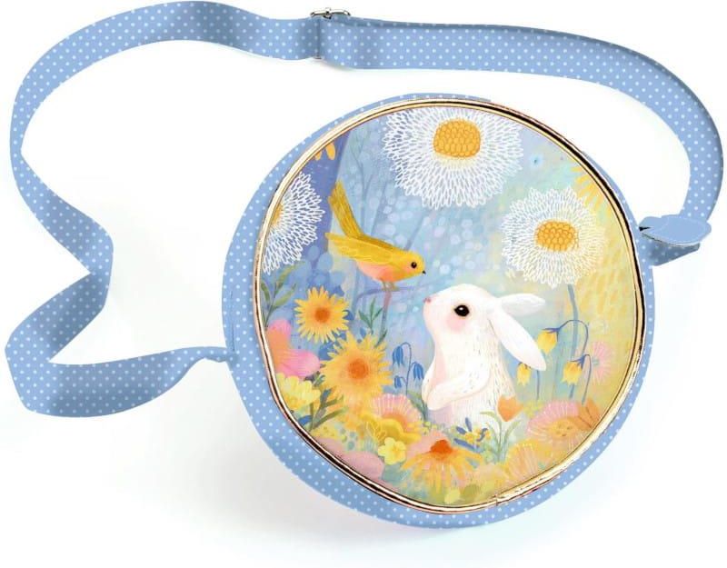 Poręczna okrągła torebka dla małej elegantki z wizerunkiem białego króliczka i żółtego ptaszka wśród malowniczych kwiatów. Ma regulowany pasek w uroczym błękitnym kolorze w drobne białe kropeczki. Zapinana na zamek. Torebka pomieści wszystkie niezbędne drobiazgi i skarby. Będzie idealnym uzupełnieniem dziecięcych stylizacji. Wymiary: 17,5 x 17 x 4,3 cm Materiał zewnętrzny: bawełna 100% Materiał wewnętrzny: 10% bawełna, 90% poliester. Opakowanie zbiorcze: 6 szt.