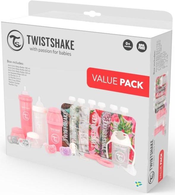 Twistshake Zestaw Startowy Dla Dzieci Zestaw startowy od Twistshake to kompleksowy zestaw produktów dla dziecka od urodzenia. Jest zapakowany w atrakcyjne pudełko prezentowe, więc doskonale sprawdzi się jako prezent dla młodych rodziców po narodzeniu dziecka. Występuje w dwóch wersjach kolorystycznych, więc pasuje zarówno dla dziewczynki, jak i chłopca. Zestaw składa się z Butelka antykolkowa 180 ML Różowa Butelka antykolkowa 260 ML Biała Butelka antykolkowa 330 ML Różowa Smoczki uspokajające 0-6M+ 2szt Różowy i Fioletowy Smoczki uspokajające 6M+ 2szt Biały i Szary Łańcuszek do smoczków Biały Gryzak wodny dla niemowląt 2M+ Różowy Kubek niekapek z mikserem 230ML Biały Wielorazowe saszetki na pokarm 6szt Butelka Antykolkowa 180ml 260ml 330ml Butelka antykolkowa Twistshake idealnie sprawdza się w karmieniu łącznym pierś-butelka. Wyposażona w unikalny system Twistflow, który zapobiega występowaniu kolek u niemowląt oraz zapewnia równomierny przepływ pokarmu. Zaprojektowana z myślą o skróceniu czasu przygotowania mlecznych posiłków dla Twojego maluszka. Cechy Butelki Twistshake Idelanie sprawdza się w karmieniu łącznym pierś - butelka Wyposażona w system Twistflow Posiada sitko-mikser, ułatwiające wymieszanie mleka Ma pojemnik na mleko w proszku, którego ilość jest zawsze odmierzona i gotowa do użycia Kształt smoczka jest inspirowany kształtem kobiecej piersi Spełnia wymagania europejskiej normy EN-14350 Nie zawiera BPA, BPS, BPF, ftalanów DEHP - jest bezpieczna dla Twojego dziecka i dla Ciebie Butelka składa się z Butelka z czytelną podziałką (180ml, 260ml, 330ml) Silikonowy smoczek antykolkowy. (0m+, 2m+, 4m+) Sitko-mikser. Zamykany pojemnik na mleko w proszku lub przekąski. Zatyczka. Nakrętka. Kubek Niekapek z Uchwytami 230ml, 4m+ Biały Idealnie sprawdzi się, kiedy Twoje dziecko uczy się pić z kubeczka. Posiada miękki ustnik niekapek zapobiegający rozlewaniu napoju, co jest szczególnie praktyczne przy aktywnym trybie życia Twojego dziecka. Bardzo wygodne, antypoślizgowe uchwyty ułatwiają trzymanie kubka w rączkach. Sitko-mikser w kubku jest innowacyjnym, zgłoszonym do patentu rozwiązaniem, dzięki któremu razem z dzieckiem możecie przygotować różnorodne smakowo napoje. Wrzuć do kubeczka ulubione owoce Twojego dziecka, nalej wody i wstrząśnij, a uzyskacie pyszny, zdrowy, naturalny napój smakowy. Dodatkowo sitko-mikser zatrzymuje cząstki owoców i zabezpiecza ustnik przed zatkaniem. Cechy kubka Szeroki otwór u góry kubka znacznie ułatwiający jego czyszczenie. Miękki ustnik, który idealnie sprawdzi się dla dzieci, które zaczynają pić z kubeczka. Jest wygodny do trzymania przez dziecko dzięki wygodnym antypoślizgowym uchwytom. Wykonany z najwyższej jakości polipropylenu. Spełnia wymagania europejskiej normy EN-14350 Nie zawiera BPA, BPS, BPF, ftalanów DEHP – jest bezpieczny dla Twojego dziecka i dla Ciebie Można go myć w zmywarce. Przeznaczony dla dzieci powyżej 4 miesiąca. Smoczek Uspokajający 0-6m 6m+ 2szt Bezpieczny i stylowy smoczek o ortodontycznym kształcie zapewniającym zdrowy rozwój zębów. Posiada otwory wentylacyjne, które zapobiegają zawilgoceniu i podrażnieniu skóry. Zaokrąglona tarcza, specjalnie dostosowana do ust niemowląt, ma cztery otwory wentylacyjne, które pomagają utrzymać suchość i wygodę skóry. Ortodontyczny kształt smoczka silikonowego zapewnia zdrowy rozwój zębów Twojego dziecka. Cechy smoczków Delikatny dla skóry dzięki czterem otworom wentylacyjnym. 100% najwyższej jakości miękkiego silikonu. Ortodontyczny kształt dla zdrowego rozwoju zębów Nie zawiera BPA, BPS, BPF, ftalanów DEHP – produkt bezpieczny dla Ciebie i dla Twojego dziecka. Produkt spełnia wymagania europejskiej normy EN1400 Opakowanie zawiera 2 sztuki. Łańcuszek Do Smoczka Biały Dziecko często gubi smoczek, na spacerze wypada mu z wózka na ziemię, podczas podróży samochodem często wpada pod fotel. Łańcuszek rozwiąże te problemy. Jest bardzo przyjemny w dotyku. Dzięki zastosowaniu nowego rodzaju klipsu, z łatwością można przypiąć go do ubrania. Cechy łańcuszka Zapobiega zgubieniu smoczka Jest przyjemny w dotyku Klips - z łatwością przymocujesz go do ubrań dziecka. Ściągany krążek - umożliwia przymocowanie smoczków Twistshake i nie tylko. Nie zawiera BPA - produkt bezpieczny dla Ciebie i dla Twojego dziecka. Produkt spełnia wymagania normy EN12586 Wodny Gryzak 2m+ Różowy Obowiązkowa pozycja dla wszystkich rodziców, których niemowlęta mają bolesne dziąsła! Chłodziarka na ząbkowanie Twistshake jest wypełniona wodą, dzięki czemu jest schłodzona, aby dziąsła Twojego dziecka były przyjemne i chłodne, gdy pojawią się pierwsze zęby. Materiał ma teksturowaną powierzchnię, która zapewnia przyjemny masaż, a haczykowaty kształt sprawia, że gryzak jest łatwy do trzymania pod każdym kątem. Jest również łatwy do trzymania za uchwyt w kształcie pierścienia - idealny do rączek niemowlęcia. Przed użyciem przechowywać w lodówce. Cechy gryzaka Nie zawiera BPA – produkt bezpieczny dla Ciebie i dla Twojego dziecka. Fakturowana powierzchnia przyjemnie masuje podniebienie. Chłodzący element przynosi ulgę swędzącym dziąsłom. Wyjątkowo lekki i poręczny. Odpowiedni dla niemowląt od 2. miesiąca życia. Plastik typu PP i EVA – wyprodukowany z materiałów klasy premium. Można schłodzić go w lodówce Saszetki na pokarm 6 x 220ml Saszetkę można wypełnić dowolną zawartością. Można także przełożyć do niej gotowe deserki ze słoiczka lub jogurty i podać bezpośrednio dziecku. Taki sposób podania pokarmu jest dużo łatwiejszy niż podawanie w formie "słoiczka i łyżeczki". Saszetka wyposażona jest w wygodny korek - umożliwiający wielokrotne zamykanie i otwieranie. Cechy saszetki Saszetki o pojemności 220 ml. Otwierają się od dołu w celu napełnienia pokarmem. Idealne do zmiksowany