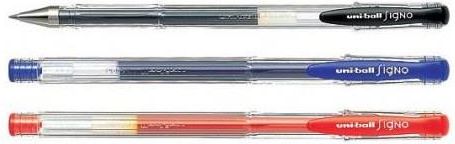 UNI Pióro Żelowe UM-100 Signo czarne. Obudowa transparentna, tusz pigmentowy, wodoodporny i odporny na blaknięcia, idealne pod nadruki reklamowe, grubość linii pisma ok. 0,3 mm, pisze gładko i szybko nieprzerwaną linią dzięki zastosowaniu wysokiej jakości płynnego tuszu, wyposażone w bezpieczną skówkę w kolorze tuszu posiadającą specjalny otwór umożliwiający oddychanie w przypadku połknięcia, wymienny wkład UMR-5.