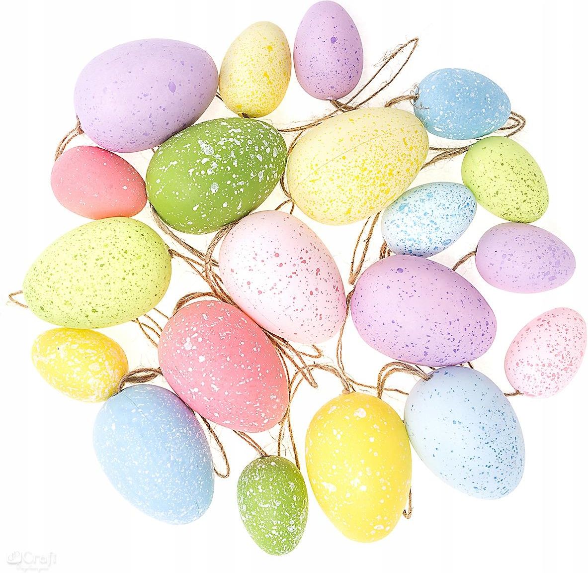 Delikatnie nakrapiane jajka z zawieszką, w pastelowych kolorach. Pisanki zostały pokryte matową farbą na bazie wody. Wysoka jakość wykonania sprawia, że prezentują się bardzo naturalnie. Niezastąpione przy tworzeniu dekoracji wielkanocnych, takich jak wieńce, stroiki, koszyczki, girlandy, itp. Zapakowane w elegnckie pudelko z okienkiem. Kolor: różowy, jasnoróżowy, fioletowy, jasnofioletowy, zielony, jasnozielony, żółty, jasnożółty , niebieski, jasnoniebieski W opkowaniu: 20 szt. Wielkość: 6 x 4 cm. 4 x 2,5 cm