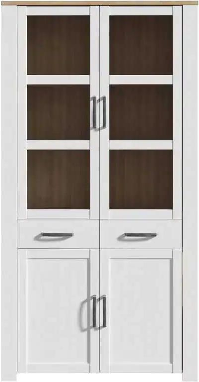 Witryna Chisbury w kolorze dębu Riviera i jasnego modrzewia Sibiu rozświetla i dodaje eleganckiego charakteru aranżacji każdego salonu lub jadalni. Mebel pasuje w szczególności do wnętrz urządzonych w stylu rustykalnym lub skandynawskim. Ma ciepłą kolorystykę i klasyczny design, który nigdy nie wychodzi z mody. Jakie zalety ma przeszklona witryna Chisbury? Wąska przeszklona witryna Chisbury oferuje optymalną ilość miejsca do przechowywania i eksponowania posiadanego wyposażenia. W jej zamkniętej szafce i szufladach można trzymać między innymi tekstylia, dokumenty czy zastawę stołową. Natomiast za przeszklonymi drzwiczkami warto ustawić ozdobne kryształy lub pamiątkową porcelanę. Montaż dodatkowego oświetlenia sprawi, że dekoracje wyeksponowane na takich półkach przyciągną wzrok i uwagę naszych gości. Dodatkowo, podświetlone wnętrza szafek nadadzą wyposażeniu wnętrza nieco bardziej nowoczesny charakter. Gdzie sprawdzi się wysoka witryna Chisbury? Witryny z kolekcji Chisbury różnią się nie tylko sposobem zagospodarowania poszczególnych brył mebli, ale również rozmiarem i ilością dostępnych szafek czy szuflad. Ze względu na swoje wymiary ta stylowa witryna do salonu będzie odpowiednim wyborem do nieco bardziej ograniczonych przestrzeni, których nie chcemy przytłoczyć dużymi meblami. Jej jasny kolor sprawi, że witryna dodatkowo rozświetli i optycznie powiększy pomieszczenie. Natomiast styl wykończenia frontów pozwoli temu modelowi odnaleźć się między innymi w aranżacji prowansalskiej, rustykalnej czy skandynawskiej. Wymiary witryny Szerokość: 106,4 cm Głębokość: 42 cm Wysokość: 205,4 cm