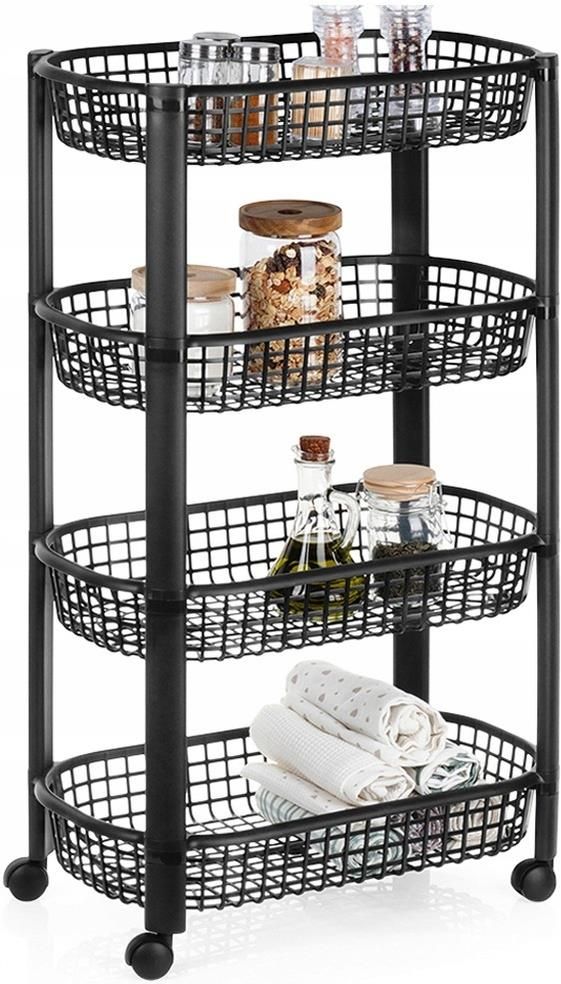 Regał na kółkach 4-poziomowy 46,5x26x79 cm Praktyczny regał na kółkach- Praktyczny, mobilny regał z czterema poziomami do przechowywania. Regał ma wymiary 46,5 x 26 x 79 cm i jest wyposażony w cztery półki w formie koszyków każdy o wymiarach 46,5 x 26 x 7,5 cm. Stabilna konstrukcja-Wykonany z lekkiego i wytrzymałego tworzywa w czarnym kolorze.Łatwy montaż regału. W razie potrzeby można go złożyć do kompaktowych rozmiarów. Regał jest stabilny i wytrzymały. Wszechstronne zastosowanie- Znajdzie zastosowanie w kuchni - możemy wykorzystać go jako dodatkowe miejsce do przechowywania np. owoców, słoików, przetworów, przypraw lub pojemników. W łazience sprawdzi się do przechowywania akcesoriów łazienkowych i kosmetyków. W biurze pozwoli uzyskać dodatkową przestrzeń do przechowywania, a w garażu umożliwi uporządkowanie narzędzi. Pojemny z czterema koszykami- Regał posiada cztery koszyki do przechowywania. Zajmuje niewielką powierzchnię, a jednocześnie jest bardzo pojemny. Mobilny, dzięki czterem kółkom- Wózek posiada cztery kółka, w tym dwa kółka mają opcję blokady, co pozwoli na jego stabilne postawienie. Dzięki kółkom w każdym momencie możemy bez wysiłku zmienić jego położenie. Praktyczny czteropoziomowy regał na kółkach. Regał jest solidnie wykonany a jednocześnie lekki. Jest bardzo poręczny, gdyż posiada kółka, dzięki którym możemy zmieniać jego położenie. Niezwykle przydatny w domu, ale również w warsztacie, czy biurze. Sprawdzi się do przechowywania różnych przedmiotów. Wyprodukowano zgodnie z europejskimi standardami. Producent: Excellent Houseware Sku: 568121 Materiał: tworzywo Długość: 46,5 cm Szerokość: 26 cm Wysokość: 79 cm Waga (g): 982 Kolor dominujący: czarny Logistyka długość(cm): 46,5 Logistyka szerokość(cm): 26 Logistyka wysokość(cm): 15 Waga gabarytowa (g): 2990 Kod ean: 8721037504485