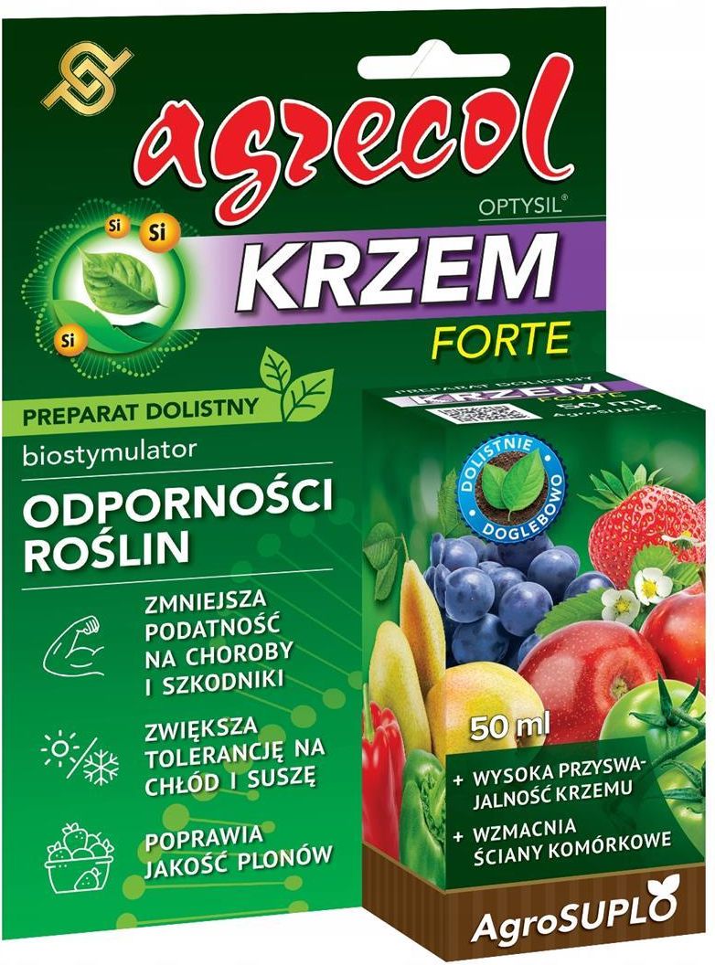 Krzem dolistny NOWOŚĆ 50 ml Krzem Forte zmniejsza podatność na choroby i szkodniki zwiększa tolerancję na chłód i suszę poprawia jakość plonów lepszy rozwój systemu korzeniowego Seria: Płynne mineralne Biostymulator, antystresant dolistny zwiększający tolerancję roślin na niekorzystne warunki uprawowe. Szczególnie pozytywnie wpływa na ograniczenie stresu abiotycznego (np. susza, okresowe niedobory wody) oraz biotycznego (czynniki chorobotwórcze, szkodniki). Preparat zawiera aktywną formę krzemu o szybkiej i pełnej przyswajalności dla roślin. Preparat może być stosowany zarówno w zabiegach dolistnych, jak i w trakcie nawadniania roślin. zwiększona tolerancja na suszę i chłód mniejsza podatność na wnikanie i rozprzestrzenianie się patogenów chorobotwórczych mniejsza podatność na uszkodzenia mechaniczne lepszy jakościowo plon – skórka mniej podatna na pękanie lepszy rozwój systemu korzeniowego – dzięki lepszemu pobieraniu fosforu ograniczenie pobierania toksycznych metali ciężkich Sposób stosowania ZABIEGI DOLISTNE: OPTYSIL® stosować nalistnie w postaci roztworu wodnego. Może być stosowany łącznie z innymi preparatami po sprawdzeniu możliwości mieszania. W trakcie zabiegów unikać dużego nasłonecznienia, wysokiej temperatury oraz wiatru powodującego znoszenie kropel. Produkt przeznaczony dla użytkowników profesjonalnych. Przygotowanie roztworu: 1 ml preparatu rozpuścić w 1 litrze wody. Napełnić opryskiwacz połową potrzebnej ilości wody następnie wlać odmierzoną dawkę preparatu i uzupełnić opryskiwacz pozostałą ilością wody. Dokładnie wymieszać. Roztwór zużyć bezpośrednio po przygotowaniu. Przygotowany roztwór wystarczy do opryskania 20 m2 upraw. Jednorazowa dawka: 5 ml/100 m2 Terminy stosowania dla wybranych gatunków (• optymalne, ○ opcjonalne): Ziemniak: wysokość roślin około 10 cm, wysokość roślin >15 cm, •początek zawiązywania bulw, •bulwy osiągają 70-80% finalnej masy. Drzewa ziarnkowe: ○ zielony pąk, •różowy/biały pąk, ○ koniec kwitnienia: większość płatków opadła, •początek rozwoju owoców, •owoc osiąga 30-50% typowej wielkości. Drzewa pestkowe: •rozwój pąków kwiatowych: 1-2 zabiegi co 5-7 dni, •rozwój zawiązków owoców, •owoc osiąga ok. połowę typowej wielkości, •początek dojrzewania owoców. Krzewy owocowe: •rozwój liści i pędów, •początek rozwoju owoców, ○ wzrost owoców – do początku dojrzewania, ○ przed początkiem przebarwiania się liści Truskawka i poziomka: ○ początek rozwoju liści i koron, •początek rozwoju kwiatostanów, ○ początek kwitnienia, •początek rozwoju pierwszych owoców, •bezpośrednio po pierwszym zbiorze. Warzywa psiankowate •rozwój liści, ○ rozwój pierwszych pąków kwiatowych, ○ początek kwitnienia, •rozwój pierwszych owoców, ○ rozwój owoców Warzywa dyniowate: •rozwój liści, •rozwój pędów bocznych, ○ początek rozwoju pąków kwiatowych, •początek rozwoju owoców. Warzywa kapustne i liściowe: •rozwój liści: 1-2 zabiegi co 7-21 dni, •początek rozwoju części przeznaczonych do zbioru, ○ części przeznaczone do zbioru osiągają ok. 50% typowej wielkości. Warzywa cebulowe: ○ początek rozwoju liści, •rozwój liści, •początek rozwoju części roślin przeznaczonych do zbioru, ○ rozwój części przeznaczonych do zbioru: 1-2 zabiegi co 7-14 dni. Warzywa korzeniowe: ○ początek rozwoju liści, •początek rozwoju korzenia spichrzowego, •rozwój korzenia spichrzowego: 1-2 zabiegi co 14-21 dni. Rozsada: •faza 1.-3. liścia. FERTYGACJA: 5 ml/100 m2. Stosować w pożywce łącznie z nawozami po wcześniejszym sprawdzeniu możliwości mieszania lub w oddzielnym cyklu fertygacyjnym. Uprawy gruntowe: stosować co 2 tygodnie. Uprawy bezglebowe: stosować do zalewania mat oraz kilkakrotnie w okresie wegetacji roślin. PODLEWANIE ROZSADY: roztwór 0,1% (10 ml OPTYSIL® w 10 l wody). Stosować 2-4 razy w okresie produkcji. Agrecol 50 ml Ze środków ochrony roślin należy korzystać z zachowaniem bezpieczeństwa. Przed każdym użyciem przeczytaj informacje zamieszczone w etykiecie i informacje dotyczące produktu. Zapoznaj się z zagrożeniami i postępuj zgodnie ze środkami ostrożności wymienionymi w etykiecie. Nabycia środków ochrony roślin mogą dokonywać jedynie osoby pełnoletnie i posiadające kwalifikacje wymagane od osób nabywających środki ochrony roślin określone w artykule 28 ustawy z dnia 8 marca 2013 r. o środkach ochrony roślin ( Dz. U. z 2017, poz. 50 z późń. zm.). Korzystając z oferty oświadczasz, że spełniasz wyżej wymienione warunki.
