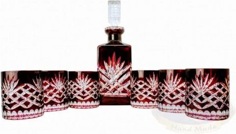 Elegancki kryształowy zestaw, który składa się z dwóch następujących produktów: Kryształowa rubin karafka do whiskyElegancka ręcznie malowana i zdobiona kryształowa karafka do whisky.Produkt wykonany jest od początku do końca ręcznie. Już sam jej kształt wydmuchiwany jest przez hutnika, następnie każdy detal poddawany jest ręcznej obróbce przez naszych Mistrzów Zdobienia. Produkt, który Państwu oferujemy wykonany jest z najwyższej jakości szkła kryształowego zawierającego 24% tlenek ołowiu całkowicie bezpieczny dla zdrowia. Pojemność: 700 mlWzór: AnanasKolor: Rubin Kryształowe rubinowe szklanki do whisky (6 sztuk)Eleganckie ręcznie malowane i zdobione kryształowe szklanki do whisky.Produkt wykonany jest od początku do końca ręcznie.Już sam kształt szklanki wydmuchiwany jest przez hutnika, następnie każda szklanka poddawana jest ręcznej obróbce przez naszych Mistrzów Zdobienia. Szklanki, które Państwu oferujemy wykonane są z najwyższej jakości szkła kryształowego zawierającego 24% tlenek ołowiu całkowicie bezpieczny dla zdrowia.Nowoczesny wzór szklanki pozwala spojrzeć na kryształ z innej strony.Pojemność: 280 mlWysokość: 9,5 cmWzór: AnanasKolor: Rubin Całość zapakowana jest w eleganckie opakowanie prezentowe wyłożone wewnątrz białym materiałem widocznym na zdjęciach.