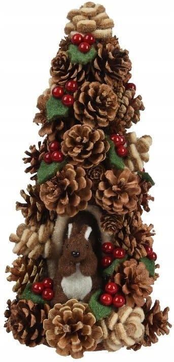 Rustykalna choinka z szyszek z filcowymi dekoracjami 17x35cm stroik ozdobny Naturalna dekoracja świąteczna w formie choinki wykonanej z prawdziwych szyszek sosnowych z dodatkiem filcowych ozdób w kształcie grzybów, zwierzątek oraz czerwonych jagód. Każdy model tej ozdoby jest unikalny i dostępny w …