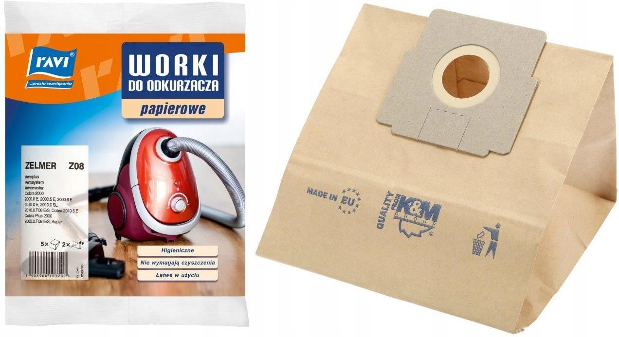 Worki do odkurzacza papierowe + 2 filtry Z08 Zelmer 5 sztuk Zapasowe worki do odkurzacza marki RAVI to idealne rozwiązanie dla osób ceniących skuteczność i wygodę sprzątania. Wykonane z trwałego, dwuwarstwowego materiału, zapewniają wysoką moc ssącą oraz długotrwałą wytrzymałość, chroniąc odkurzacz przed zapychaniem. Dzięki solidnej konstrukcji są odporne na uszkodzenia, co sprawia, że służą przez długi czas. W zestawie znajduje się 5 worków, które efektywnie zbierają kurz, brud i inne zanieczyszczenia, gwarantując czystość i higienę w domu. Zalety Trwały materiał – worki wykonano z wysokiej jakości, dwuwarstwowej tkaniny, co zwiększa ich odporność na uszkodzenia mechaniczne. Skuteczna filtracja – doskonale zatrzymują kurz i zabrudzenia, wspomagając wydajność odkurzacza oraz utrzymanie czystego powietrza w domu. Higieniczne użytkowanie – po zapełnieniu wystarczy je wyrzucić, bez konieczności czyszczenia i kontaktu z zabrudzeniami. Długi czas użytkowania – zestaw zawiera 5 sztuk, co zmniejsza częstotliwość zakupu nowych worków i zapewnia wygodę na dłużej. Wytrzymałość i niezawodność – odporność na rozerwanie gwarantuje bezproblemowe użytkowanie bez ryzyka uszkodzenia. Uniwersalność – pasują do wielu modeli odkurzaczy Zelmer, co czyni je wszechstronnym rozwiązaniem dla różnych potrzeb. Worki przeznaczone do typów odkurzaczy ZELMER: 2000, 2000.0 E, 2000.0 F08 E, 2000.0 F08 S, 2000.5 E, 2010, 2010.0 E, 2010.0 F08 E, 2010.0 F08 S, 2010.0 SL, 2010.5 E, Aeromaster, Aeroplus, Aerosystem, Cobra, Cobra 2000.0 E, Cobra 2000.5 E, Cobra 2000.6 E, Cobra 2010.0 E, Cobra 2010.0 SL, Cobra 2010.0.F08 E, Cobra 2010.0.F08 S, Cobra 2010.5 E, Cobra Plus 2000.0.F08 E, Cobra Plus 2000.0.F08 S, Plus, Super Parametry Marka: Ravi Zastosowanie: Worki do odkurzacza Zestaw zawiera: 5 szt. worków