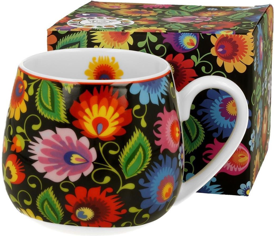 Kubek baryłka ETNIC to wyjątkowy produkt, który z pewnością przyciągnie uwagę swoim pięknym wzornictwem i funkcjonalnością. Oto kilka kluczowych cech tego kubka: Materiał i jakość wykonania: Wykonany z porcelany New Bone China, co oznacza, że jest trwały, lekki i charakteryzuje się naturalnym kremowo-białym kolorem z delikatnym połyskiem. Porcelana New Bone China jest twardsza i bardziej wytrzymała od ceramiki, zachowując jednocześnie delikatność i lekkość. Design: Kubek ma pojemność 430 ml i jest w kształcie baryłki. Wewnątrz jest biały, a na zewnątrz zdobiony jest regionalnymi, wyrazistymi kolorowymi wycinankami w kształcie kwiatów i pawich oczek na intensywnie czarnym tle. Motyw ten nadaje mu niezwykłą elegancję i przyciąga wzrok. Prezentowy charakter: Całość jest zapakowana w ozdobne pudełko z okienkiem, które prezentuje ten sam piękny motyw. To doskonały pomysł na niebanalny prezent urodzinowy dla każdej osoby, niezależnie od płci. Możesz go także podarować jako wyraz podziękowania dla szefa czy nauczyciela. Wybierając ten kubek, inwestujesz w produkt, który łączy w sobie piękno, funkcjonalność i trwałość. Zachęcamy do zakupu, ponieważ taki kubek to nie tylko codzienny przedmiot, ale także wyjątkowy dodatek do Twojej kuchni lub biurka. Dane produktu Pojemność maksymalna 430 ml Średnica 8 cm Wysokość 9 cm Szerokość z uchem 12,5 cm Waga netto 0,31 kg Waga brutto 0,36 kg Zastosowanie Zmywarka Tak Mikrofalówka Tak Giftbox Szerokość pudełka 10,3 cm Długość pudełka 12 cm Wysokość pudełka 9,5 cm Podane wymiary oraz pojemności podawane są zgodnie z opisem producenta. Najczęściej pojemność podana to pojemność całkowita (po sam brzeg naczynia), może się różnić od pojemności użytkowej. Firma Duo Gift, z siedzibą w Polsce, jest dumna z swojej historii, która sięga końca lat 90’. Od tego czasu, misja firmy polegała na wprowadzaniu na rynek wyjątkowej porcelany prezentowej, która wyróżnia się na tle codziennych zastaw stołowych. Dzięki ciężkiej pracy i nieustannemu dążeniu do doskonałości, zdobyli ogromne doświadczenie, które pozwoliło zbudować im solidną markę, rozpoznawalną nie tylko w Polsce, ale na całym świecie. Ich zaangażowanie w jakość i innowacje zaowocowało zaufaniem klientów, które stale wzmacniane jest poprzez prezentację produktów na najważniejszych targach branżowych, zarówno w Polsce, jak i w takich europejskich metropoliach jak Frankfurt, Paryż i Mediolan. Zapraszamy do odkrycia świata Duo Gift - miejsca, gdzie porcelana staje się sztuką.