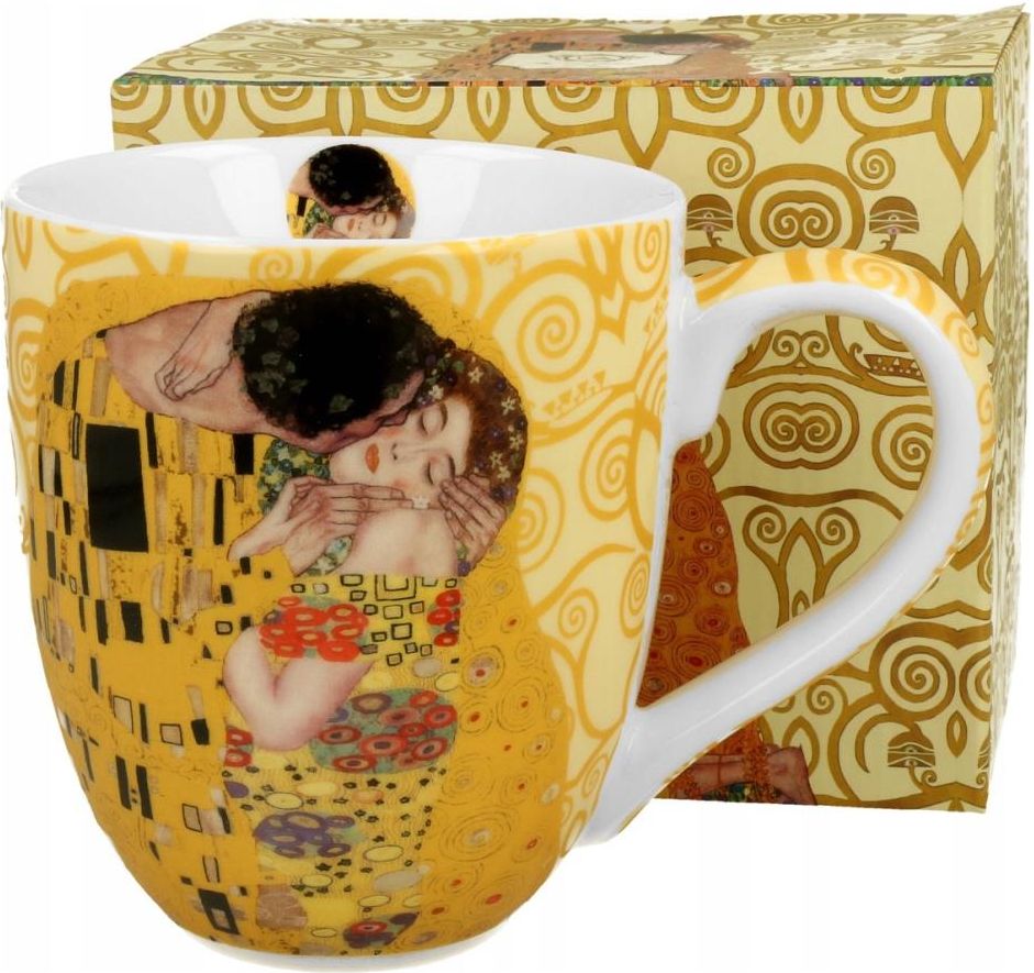 Kubek XXL Gustav Klimt THE KISS ECRU porcelana Bone China PREZENT - 1000 ml Kubek THE KISS by Gustav Klimt - 1000 ml Zasługujesz na absolutnie wyjątkowy prezent w postaci kubka z najwyższej jakości porcelany, który sprawi, że parzenie herbaty stanie się prawdziwą ceremonią! Piękny i funkcjonalnyzestaw, na który składa się: kubek o dużej pojemności i prezentowe opakowanie. Kubek został wykonany z najwyższej jakości porcelany. Ozdobiony reprodukcją obrazu ,,Pocałunek" Gustava Klimta - jednego z najważniejszych dzieł austriackiej secesji. Wzór został wykonany w ciepłych barwach z elementami połyskującego złota. Wyrazista kolorystyka i precyzja zdobienia sprawiają, że komplet prezentuje się niezwykle elegancko i przykuwa spojrzenie. Taki zestaw uprzyjemni każdą chwilę delektowania się herbatą, czy naparem z ziół. To idealna propozycja na prezent! Dołączone do zestawu dekoracyjne pudełko samo w sobie stanowi piękną ozdobę i nie wymaga dodatkowego pakowania. Paczka ulubionej herbaty wraz z porcelanowym kubkiem stanowi idealną prezentową parę, którą zachwyci się każdy. Oprócz wyjątkowego wyglądu i niezwykłej praktyczności taki zestaw pokaże bliskiej osobie, że troszczycie się o jej zdrowie, gdyż herbata posiada wiele cudownych właściwości. Szczegółowe informacje Elementy zestawu: kubek, ozdobne pudełko. Producent: Duo Pojemność kubka: 1000 ml Średnica: 12 cm Wysokość kubka: 13,5 cm Szerokość z uchem: 17,5 cm Materiał: porcelana New Bone China Porcelana typu Bone China jest gładka, bardzo delikatna i charakteryzuje się czystym, śnieżnobiałym kolorem. Dzięki zastosowaniu do produkcji glinek, gliny, kwarców i skaleni porcelana ta jest twardsza i bardziej wytrzymała od ceramiki przy jednoczesnym zachowaniu delikatności i lekkości. Wysoka jakość wykonania i użytych materiałów sprawia, że porcelana kostna jest ekskluzywnym wyrobem. Porcelanę można myć w zmywarce.