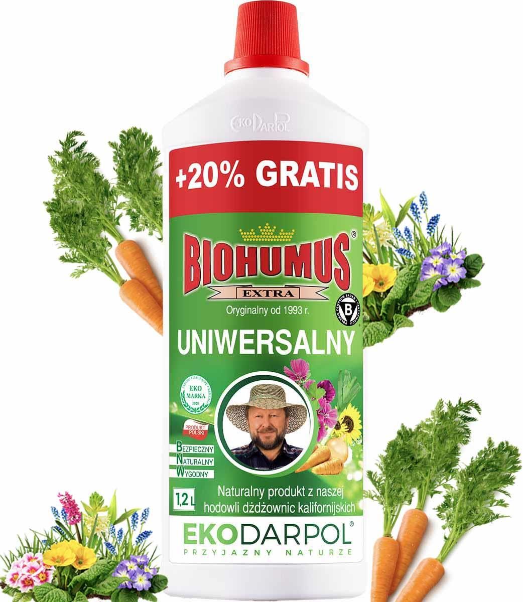{desc/100/} EKODARPOL BIOHUMUS EXTRA Uniwersalny 1L + 20% gratis {desc/50/} {desc/50/} Naturalne wsparcie dla wszystkich roślin EKODARPOL Biohumus Extra Uniwersalny to organiczny nawóz, który dostarcza roślinom niezbędnych składników odżywczych, stymulując ich wzrost i zdrowy rozwój. Przeznaczony do wszystkich rodzajów roślin – zarówno doniczkowych, balkonowych, jak i ogrodowych. Regularne stosowanie zapewnia intensywną zieleń liści, długie i obfite kwitnienie roślin ozdobnych oraz zdrowe, obfite plony warzyw i owoców. Dzięki naturalnej formule Biohumus Extra nie zawiera sztucznych dodatków, jest bezpieczny dla roślin i nie powoduje ryzyka przenawożenia. Produkt polecany zarówno dla początkujących, jak i doświadczonych ogrodników! {desc/50/} Specyfikacja Pojemność: 1 L + 20% GRATIS Forma: Płynny nawóz organiczny Przeznaczenie: Wszystkie rośliny doniczkowe, balkonowe, ogrodowe, warzywa, owoce Skład: Naturalne substancje organiczne, mikroorganizmy (Azotobacter spp., Pseudomonas spp.), bakterie fosforowe i celulolityczne, promieniowce (Actinobacteria) Bezpieczeństwo: Bez dodatków chemicznych, bez ryzyka przenawożenia Przechowywanie: W oryginalnym, szczelnie zamkniętym opakowaniu, w temperaturze +2°C do +30°C {desc/50/} {desc/50/} {desc/50/} Zastosowanie i przeznaczenie Roślin doniczkowych (kwiaty, zioła, rośliny ozdobne w domu i biurze) Roślin balkonowych (pelargonie, surfinie, petunie, begonie itp.) Roślin ogrodowych (krzewy ozdobne, byliny, warzywa, drzewa owocowe) Upraw warzywnych i sadowniczych (pomidor, papryka, truskawki, maliny i inne) Dzięki naturalnej kompozycji jest bezpieczny i skuteczny dla wszystkich roślin, zapewniając im optymalne warunki wzrostu. {desc/50/} Naturalny i ekologiczny skład Wyprodukowany z wyselekcjonowanych oborników, uszlachetnionych przez dżdżownice kalifornijskie, które wzbogacają go w pożyteczną mikroflorę bakteryjną, poprawiającą zdrowie i kondycję roślin. Wspomaga wzrost i kwitnienie Regularne stosowanie zapewnia intensywną zieleń liści oraz długotrwałe i obfite kwitnienie roślin ozdobnych. {desc/50/} {desc/50/} {desc/50/} Zwiększa plonowanie warzyw i owoców Wspiera zdrowy rozwój systemu korzeniowego, dzięki czemu warzywa i owoce dają obfitsze i zdrowsze plony. Poprawia odporność roślin Wzmacnia rośliny, pomagając im przetrwać trudne warunki atmosferyczne i stres środowiskowy. Przygotowuje rośliny do lepszego zimowania. {desc/50/} Sposób użycia Przygotowanie roztworu – przed użyciem wstrząsnąć butelką. Dawkowanie – rozcieńczyć Biohumus Extra w wodzie w proporcji odpowiedniej dla danego rodzaju roślin (zazwyczaj 1:10 lub zgodnie z zaleceniami na etykiecie). Podlewanie – stosować podlewanie u korzeni, unikając zraszania liści. Częstotliwość stosowania – stosować regularnie, w zależności od potrzeb roślin: Rośliny doniczkowe i balkonowe: co 1–2 tygodnie Warzywa i owoce: co 7–14 dni Rośliny ogrodowe: co 2–4 tygodnie Można stosować przez cały sezon wegetacyjny – od wiosny do jesieni. {desc/50/} {desc/50/} {desc/50/} Dlaczego warto wybrać EKODARPOL Biohumus Extra? 100% naturalny skład – przyjazny dla środowiska, nie zawiera chemii Łatwa aplikacja – wystarczy wymieszać z wodą i podlewać rośliny Doskonałe efekty – wspomaga wzrost, kwitnienie i plonowanie Poprawia strukturę gleby – wzbogaca ją o cenne mikroorganizmy Sprawdzony przez ogrodników i działkowców – rekomendowany przez specjalistów