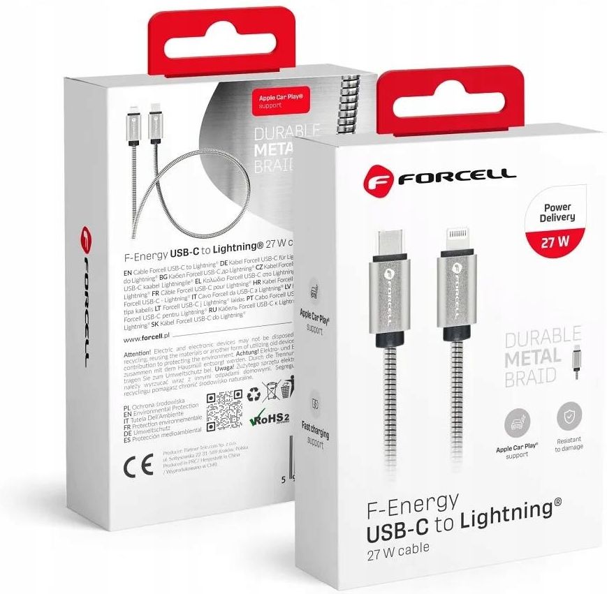 Forcell Szybki Kabel USB typ C do Lightning 8pin Apple CarPlay | Power Delivery | 3A | 27W | 100cm Forcell to europejska marka akcesoriów GSM, która stawia na styl i wygodę użytkowania, dlatego jej produkty to idealny wybór dla osób ceniących sobie wysoką jakość i ponadczasowy design. Dlaczego warto kupić ten kabel Multimedialny kabel do transmisji danych oraz ładowania urządzeń marki Apple ze złączem typu Lightning. Wykonany ze stali nierdzewnej jest wytrzymały i odporny na korozję oraz uszkodzenia mechaniczne. Pozwala na szybkie ładowanie urządzeń dzięki technologii Power Delivery i mocy 27 W. Długi przewód (1 m) pozwala na wygodne korzystanie z urządzenia, gdy jest podłączone do sieci. Zastosowane solidnych materiałów zapewnia bezpieczną i niezakłóconą czynnikami zewnętrznymi pracę kabla. Wytrzymały i odporny na korozję Zastosowanie solidnych materiałów gwarantuje bezpieczną i niezakłóconą czynnikami zewnętrznymi pracę kabla. Przewód jest cienki, lekki i działa bez zakłóceń. Współpracuje z urządzeniami marki Apple Posiada złącze typu USB-C do Lightning, dlatego pozwala na ładowanie i synchronizację danych urządzeń Apple: iPhone, iPad, iPod i AirPods. Możesz go też wykorzystać w samochodzie obsługującym funkcję Apple CarPlay przez przewód USB – po podłączeniu możesz bezpieczne korzystać z telefonu: odbierać połączenia, słuchać muzyki. Szybkie ładowanie i transfer danych Kabel o mocy 27 W umożliwia szybkie i bezpieczne ładowanie w standardzie Power Delivery oraz pozwala dzielić się ważnymi plikami i dokumentami. Przesyłaj zdjęcia, filmy, pliki audio z urządzenia na urządzenie. Długość 1 m pozwala na swobodną pracę z urządzeniem, zarówno w domu jak i w samochodzie. Bezpieczeństwo Wbudowane zabezpieczenia gwarantują ochronę przed zwarciami i skokami napięcia w urządzeniach przewodzących prąd. Produkt posiada również certyfikaty CE i RoHS. Najważniejsze informacje oryginalny produkt Forcell długość 100cm złącza USB-C na Lightning zabezpieczony termicznie ładowanie i przesyłanie danych wielowarstwowe ekranowanie szybkie ładowanie wspiera Apple CarPlay obsługuje Power Delivery wytrzymały oplot Natężenie 3A (27W) zwiększona żywotność zapakowany w oryginalne opakowanie