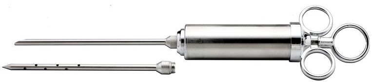 Szpryca- Strzykawka do mięs niemieckiej marki Weis wykonana została z wysokiej jakości stali nierdzewenej. Służy do marynowania różnego rodzaju mięs, zwłaszcza większych kawałków. Uchwyt z dwoma pierścieniami na palce zapewnia wygodę użytkowania. Strzykawkę wykorzystać można do wprowadzania w mięso marynat, sosów, oleju. Świetnie sprawdzi się przy przygotowywaniu mięs do wędzenia i pieczenia oraz wypełniania np. pączków dżemami. Po użyciu strzykawkę łatwo jest rozłożyć do mycia, stalowe elementy nadają się do mycia w zmywarce (silikonowe uszczelki myjemy ręcznie).