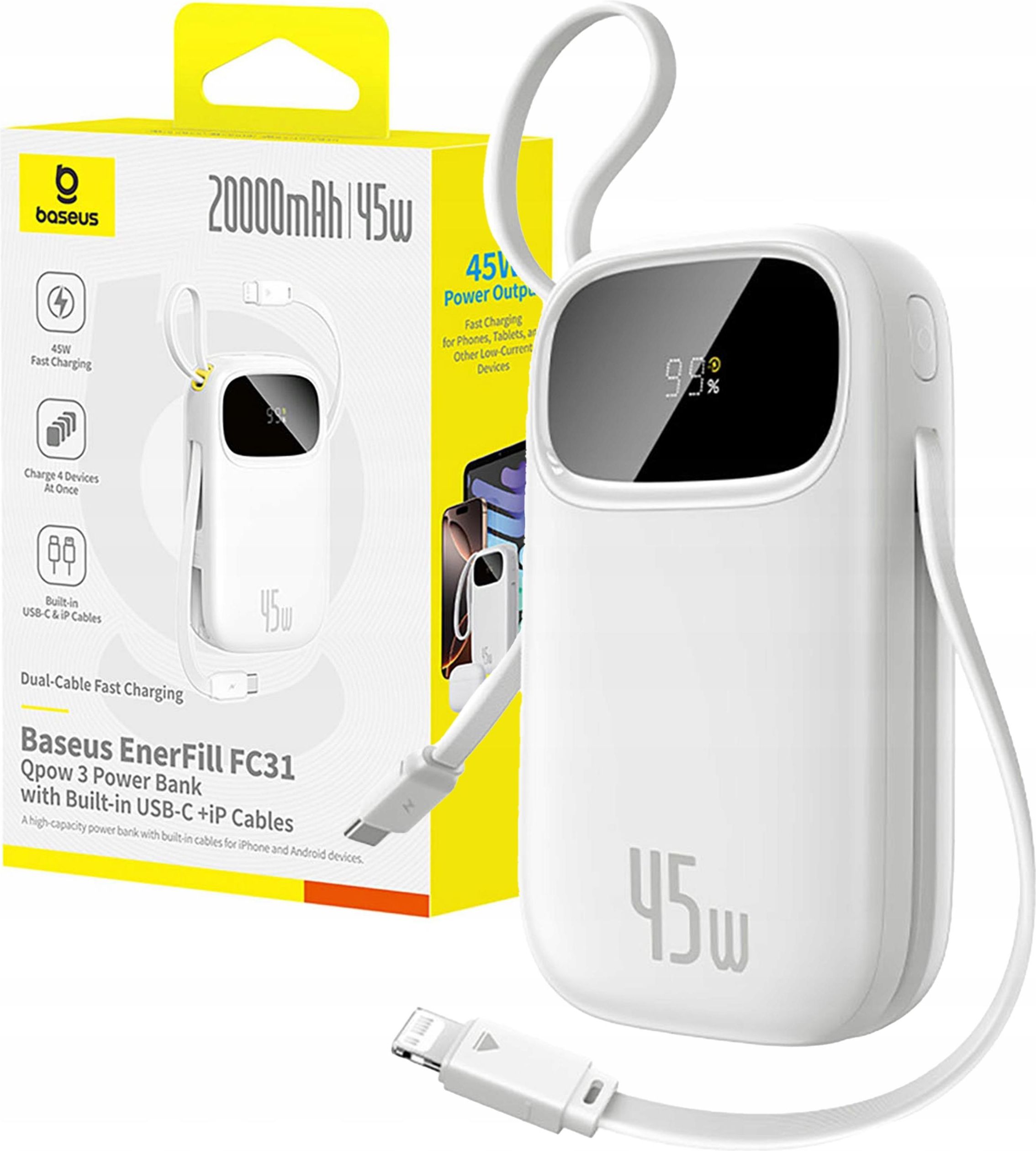 Powerbank Baseus EnerFill FC31 20000mAh 45W z wyświetlaczem cyfrowym i 2 wbudowanymi kablami (USB-C + Lightning) - biały EAN: 6932172695811 SKU: E0028D01 Powerbank Baseus EnerFill FC31 20000mAh 45W z wyświetlaczem cyfrowym i 2 wbudowanymi kablami (USB-C + Lightning) - biały Powerbank Baseus …