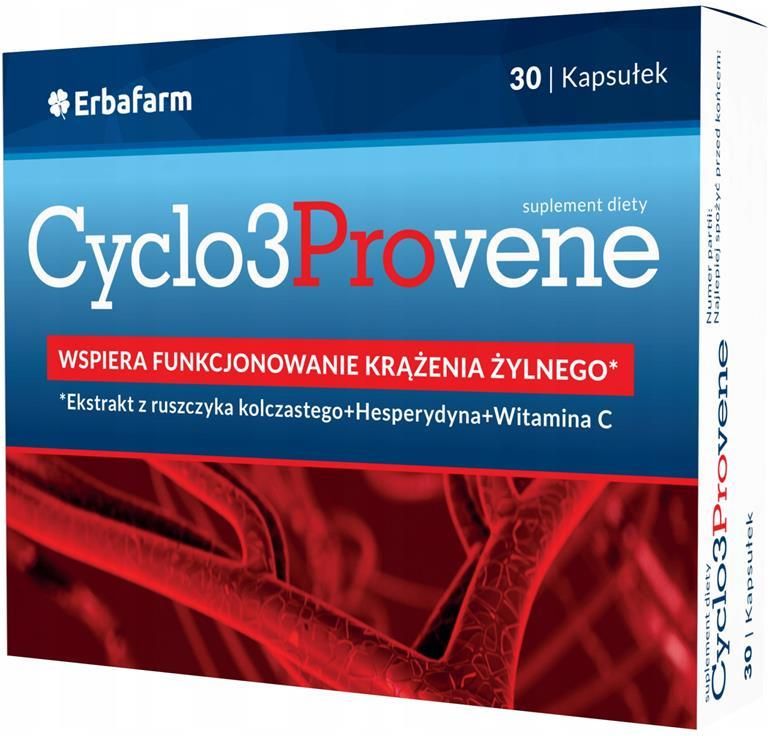 CYCLO 3 PROVENE Suplement diety Opakowanie: 30 kapsułek Zastosowanie Wsparcie krążenia żylnego, Stosowany przy uczuciu zmęczonych i ciężkich nóg. Właściwości Suplement pomagający zmniejszyć obrzęk oraz wspierający funkcjonowanie krążenia żylnego. Zawarta w składzie witamina C pomaga w prawidłowej produkcji kolagenu celu zapewnienia prawidłowego funkcjonowania naczyń krwionośnych. Dawkowanie : 1 kapsułka dziennie Składniki Metylchalkon hesperydyny (w tym 95 % hesperydyny), ekstrakt z korzenia ruszczyka kolczastego (Ruscus aculeatus L.), witamina C (kwas L-askorbinowy), olej sojowy, żelatyna, glicerol, lecytyna sojowa, wosk pszczeli biały, mono- i diglicerydy kwasów tłuszczowych, dwutlenek krzemu. Składniki 1 kapsułka % RWS* Metylchalkon hesperydyny (w tym 95 % hesperydyny) 150 mg Ekstrakt z korzenia ruszczyka kolczastego 100 mg - Witamina C 100 mg 125,00% * RWS - Referencyjna Wartość Ostrzeżenia dotyczące bezpieczeństwa Nie stosować w przypadku uczulenia na którykolwiek ze składników produktu. Nie należy przekraczać zalecanej dziennej porcji. Dla utrzymania prawidłowego stanu zdrowia należy stosować zróżnicowaną dietę i prowadzić zdrowy tryb życia. Suplement diety nie może być stosowany jak substytut (zamiennik) zróżnicowanej diety. Przechowywać w temperaturze pokojowej. Suplementy diety powinny być przechowywane w sposób niedostępny dla małych dzieci. Producent: Erbafarm Naturale