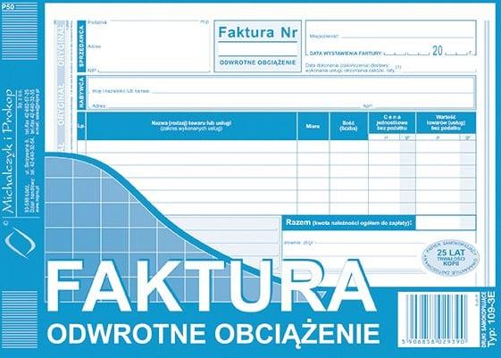 103-3E FAKTURA WZÓR PEŁNY DLA PROWADZĄCYCH SPRZEDAŻ W CENACH NETTO * Format:A5 * Rodzaj papieru: samokopiujący * Zastosowanie: faktury i inne dokumenty wynikające z przepisów o podatku od towarów i usług * Oprawa: bloczek 80 kartek * Druk: jednostronny (oryginał + kopia)