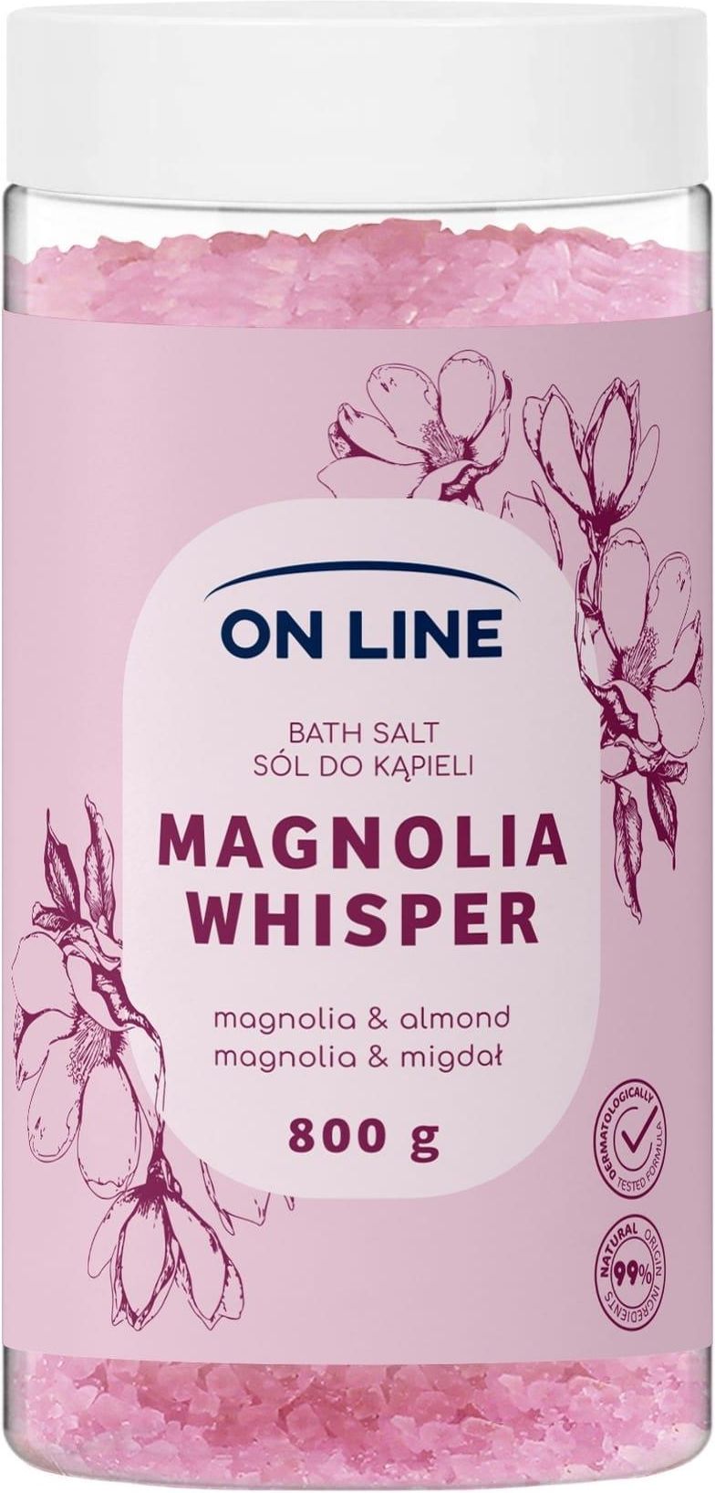 ON LINE Sól do kąpieli Magnolia Whisper 800 g Odkryj wyjątkowe doznania podczas kąpieli z ON LINE Sól do kąpieli Magnolia Whisper. Ta luksusowa sól do kąpieli, wzbogacona kolagenem, mleczkiem migdałowym oraz ekstraktem z magnolii, nie tylko pielęgnuje, ale także rewitalizuje Twoją skórę, pozostawiając ją jedwabiście gładką i odżywioną. Ciesz się wyjątkowym zapachem magnolii, który odpręża i wprowadza w stan błogiego relaksu. Idealna do codziennych rytuałów pielęgnacyjnych, sprawi, że każda kąpiel stanie się chwilą tylko dla Ciebie. Wzbogacona kolagenem i mleczkiem migdałowym Ekstrakt z magnolii dla wyjątkowego zapachu Pielęgnacja i rewitalizacja skóry Ostrzeżenie: Chronić przed światłem. Sposób użycia: 3 nakrętki soli wsypać do wanny pod strumień ciepłej wody, dokładnie wymieszać. Skład: Sodium Chloride, Magnolia Biondii Bud/Flower Extract, Prunus Amygdalus Dulcis Seed Extract, Hydrolyzed Collagen, Silica, Glycerin, Macadamia Ternifolia Seed Oil, Parfum, Tocopherol, Hydrogenated Olive Oil Caprylyl Esters, Aqua, Triheptanoin, Trilaurin, Hydrogenated Lecithin, Xanthan Gum, Butylene Glycol, Sodium Benzoate, Potassium Sorbate, Benzyl Alcohol, Dehydroacetic Acid, Citric Acid, Sodium Sulfate, Hexyl Cinnamal, Linalool, CI 14720.